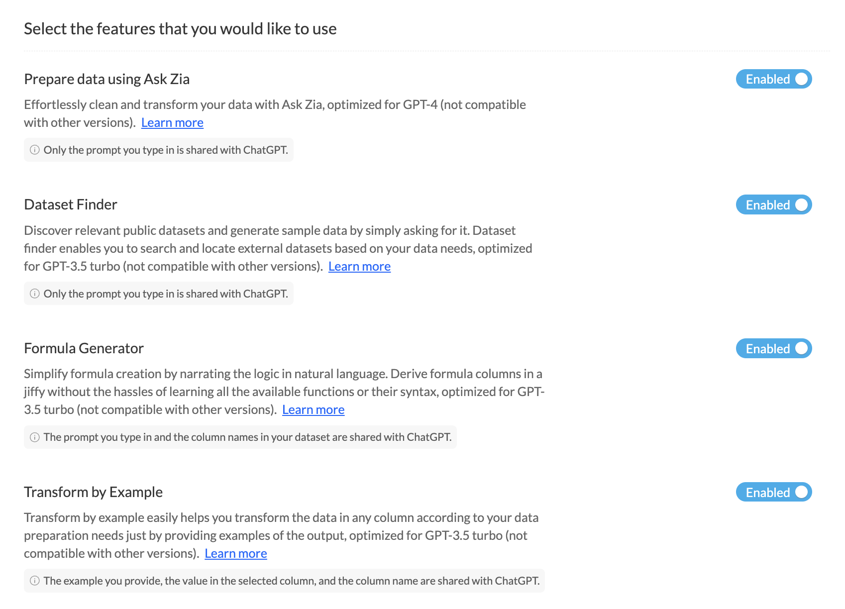 Info データのプライバシーに関するご案内: Zoho DataPrepは、米国を拠点とする外部サービスであるOpenAIのChatGPT APIを利用しており、OpenAIの利用規約が適用されます。OpenAIへの情報送信は、ユーザーが提供したアクセス権限によって決まります。ChatGPTへのデータ共有は、有効化した機能に応じて行われます。たとえば、列名や選択したセルのデータなど、機能ごとに共有される内容が異なります。共有したいデータの範囲に応じて、各機能を有効または無効にすることが可能です。このサービスをご利用の際は、機密情報や個人情報を含まないよう十分ご注意ください。