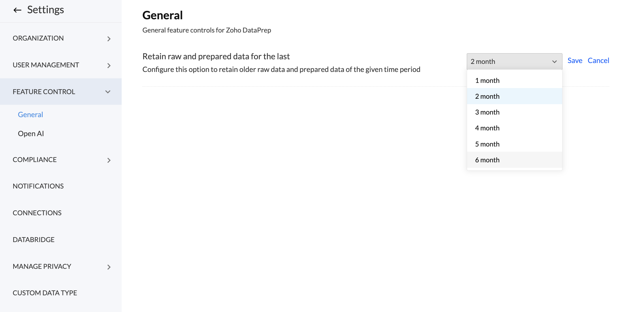 Zoho DataPrepの一般機能制御では、生データおよび加工済みデータを過去6か月間保持できます。