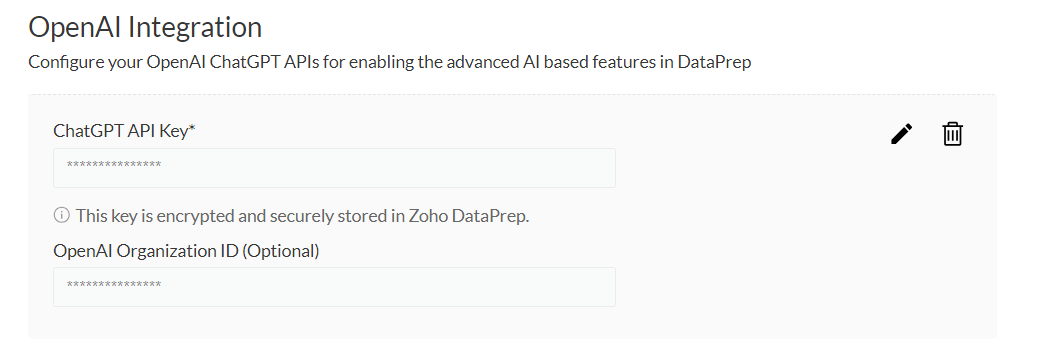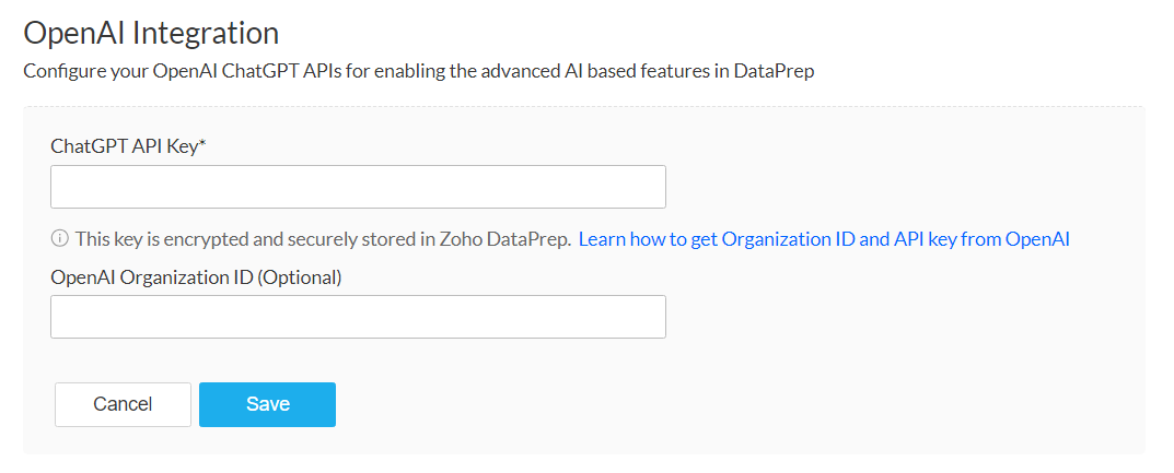 Notes メモ : キーは暗号化され、Zoho DataPrep内で安全に保管されます。OpenAIから組織IDやAPIキーを取得する方法はこちらをご参照ください