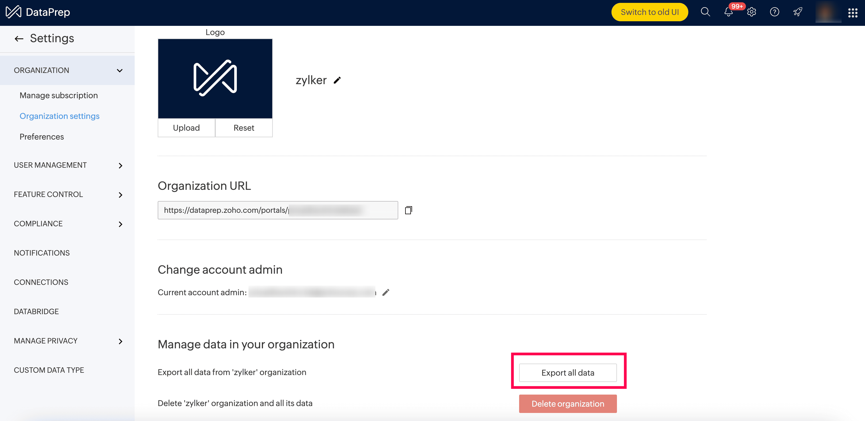 すべてエクスポート data」オプションを設定ページから利用し、いつでもバックアップを取得できます。組織が完全に削除される前にご利用ください。