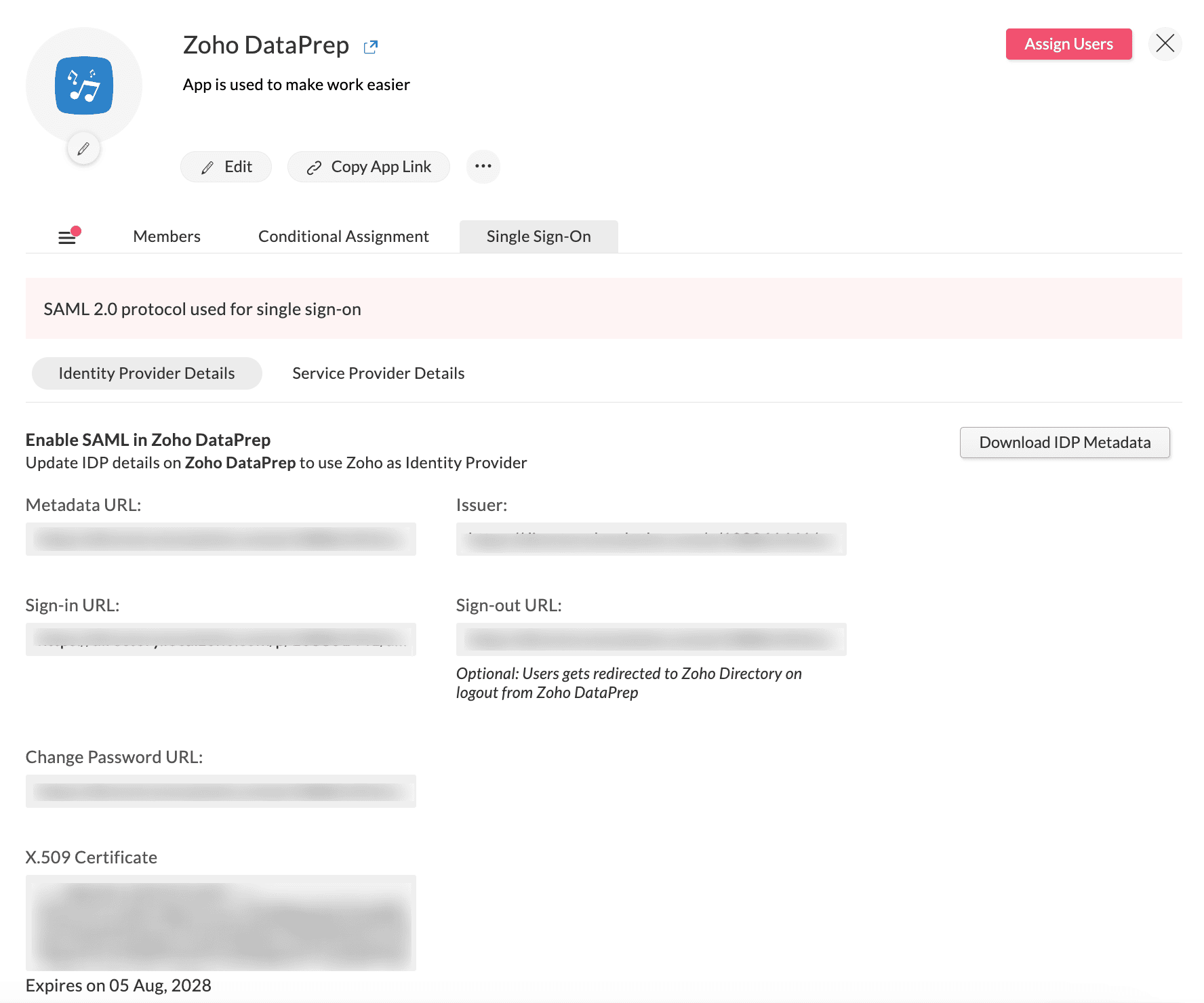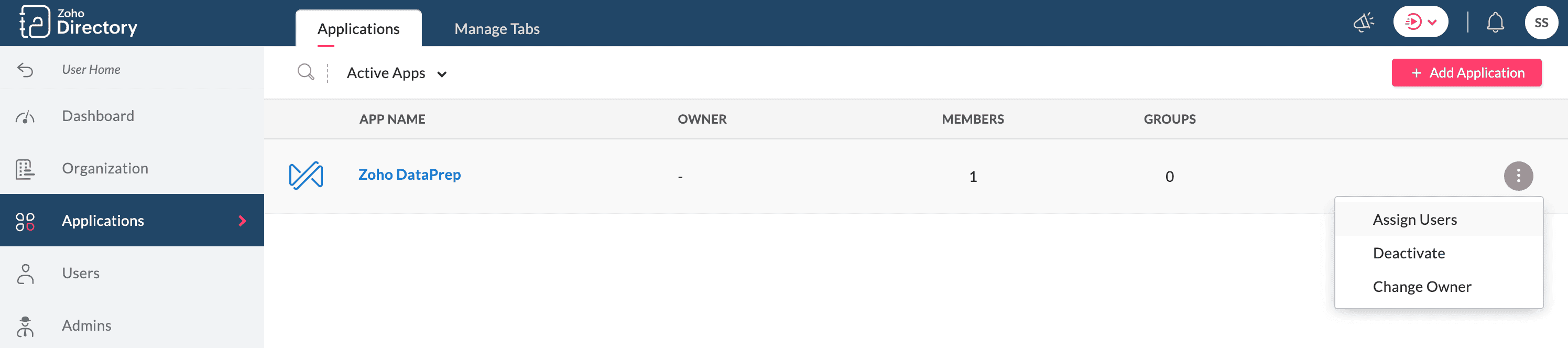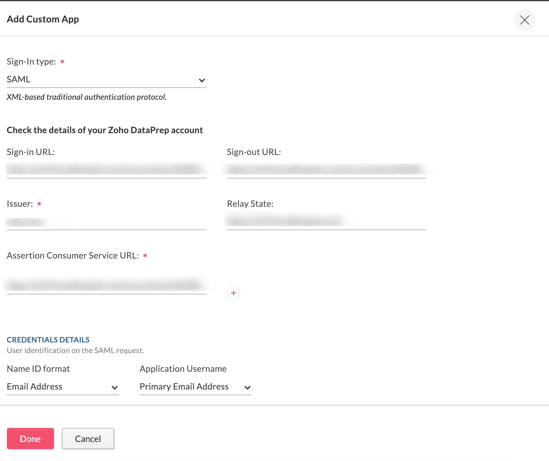 重要:Zoho Directoryでカスタムアプリケーションを無効化または削除した場合でも、Zoho DataPrepに関連付けられたSAML構成は有効なままとなり、リダイレクトやアクセスエラーの原因となることがあります。