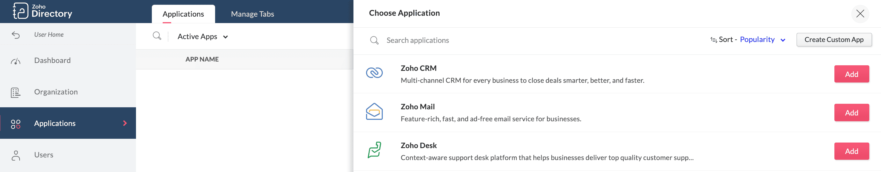 2. 左側のペインからアプリケーションを選択し、アプリケーション追加ボタンをクリックします。カスタムアプリ作成オプションをクリックします。