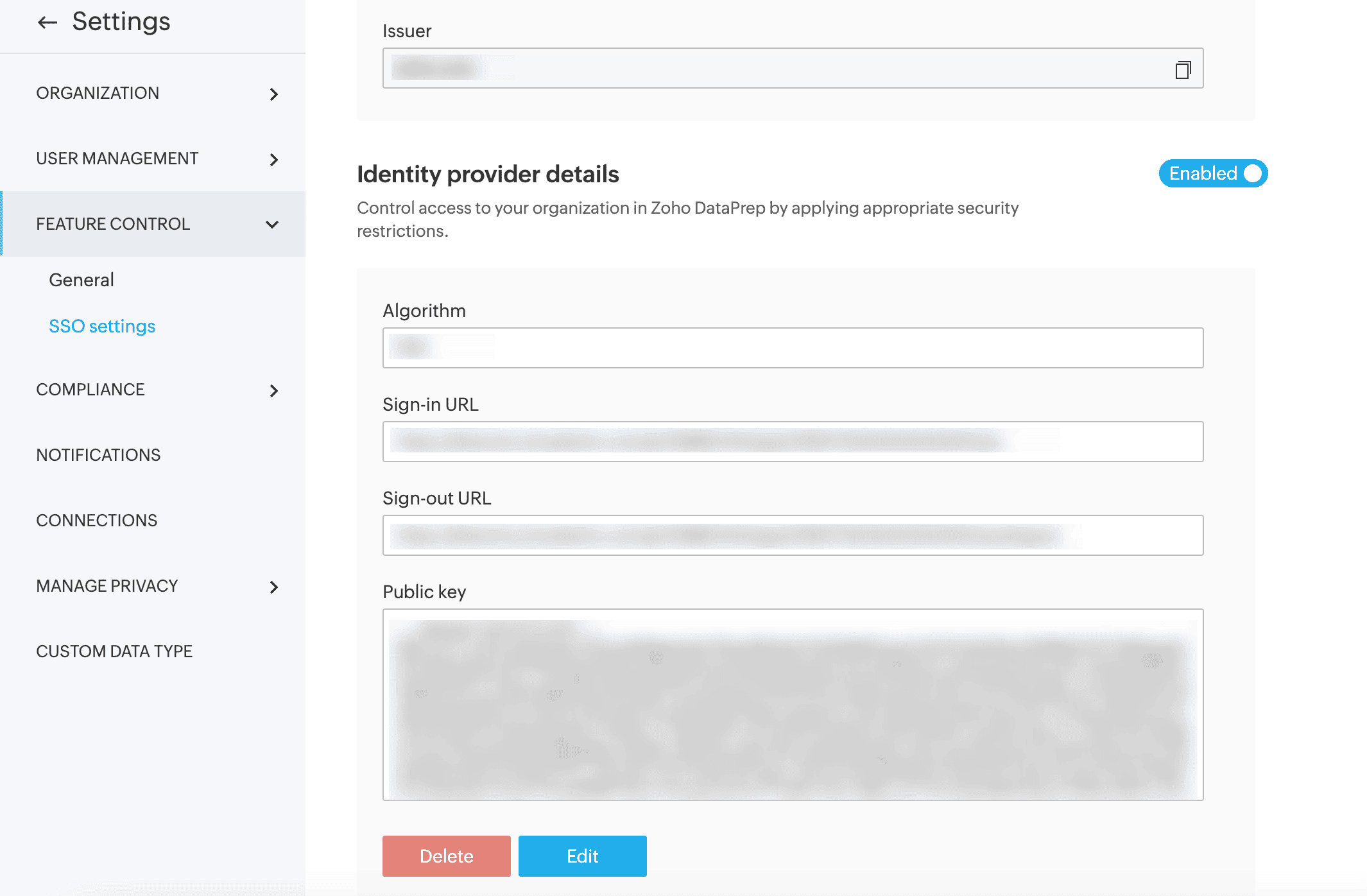 7. 上記の詳細をDataPrepアカウントにコピー&ペーストし、保存をクリックします。Zoho DataPrep→設定→Feature Control→SSO設定→Identity Providerの詳細へ進みます。