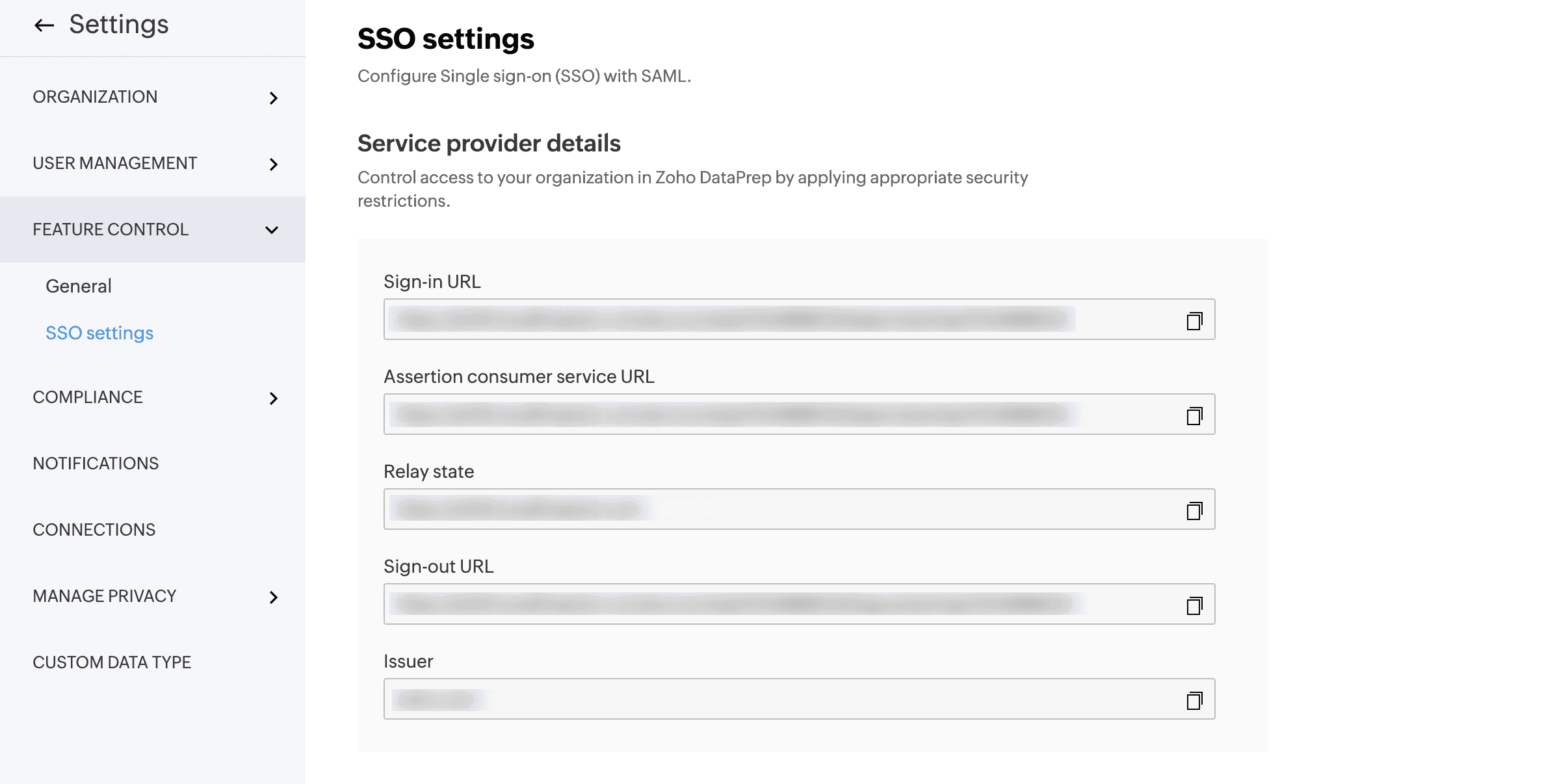 4. Zoho DataPrepアカウントから以下のサービスプロバイダー詳細を入力してください。これらの詳細は、Zoho DataPrep→設定→Feature Control→SSO設定→サービスプロバイダー詳細で確認できます。