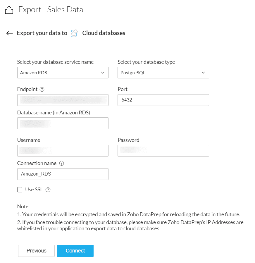 メモ: データベースへの接続に問題が発生した場合は、Zoho DataPrepのIPアドレスがご利用のアプリケーションでホワイトリスト登録されているか確認し、クラウドデータベースへのデータのエクスポートができるようにしてください。