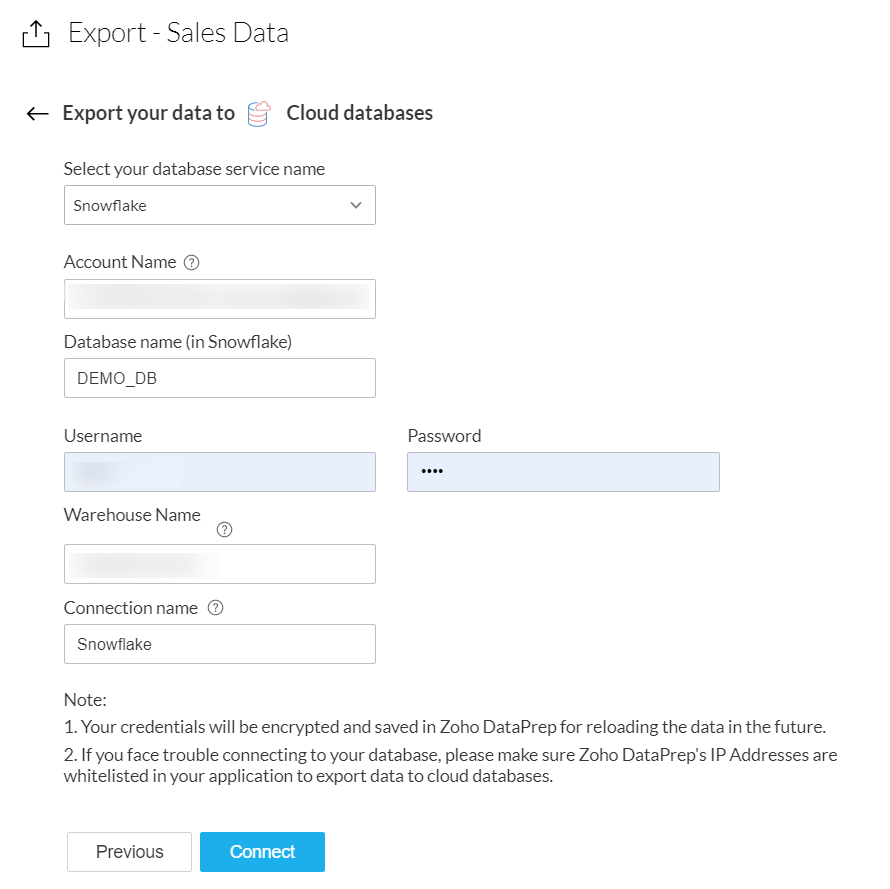 メモ: データベースへの接続に問題が発生した場合は、Zoho DataPrepのIPアドレスがご利用のアプリケーションでホワイトリストに登録されていることをご確認ください。クラウドデータベースへのデータのエクスポート時に必要です。Zoho DataPrepのIPアドレスについては