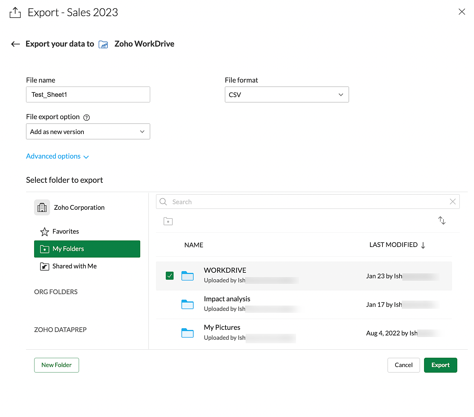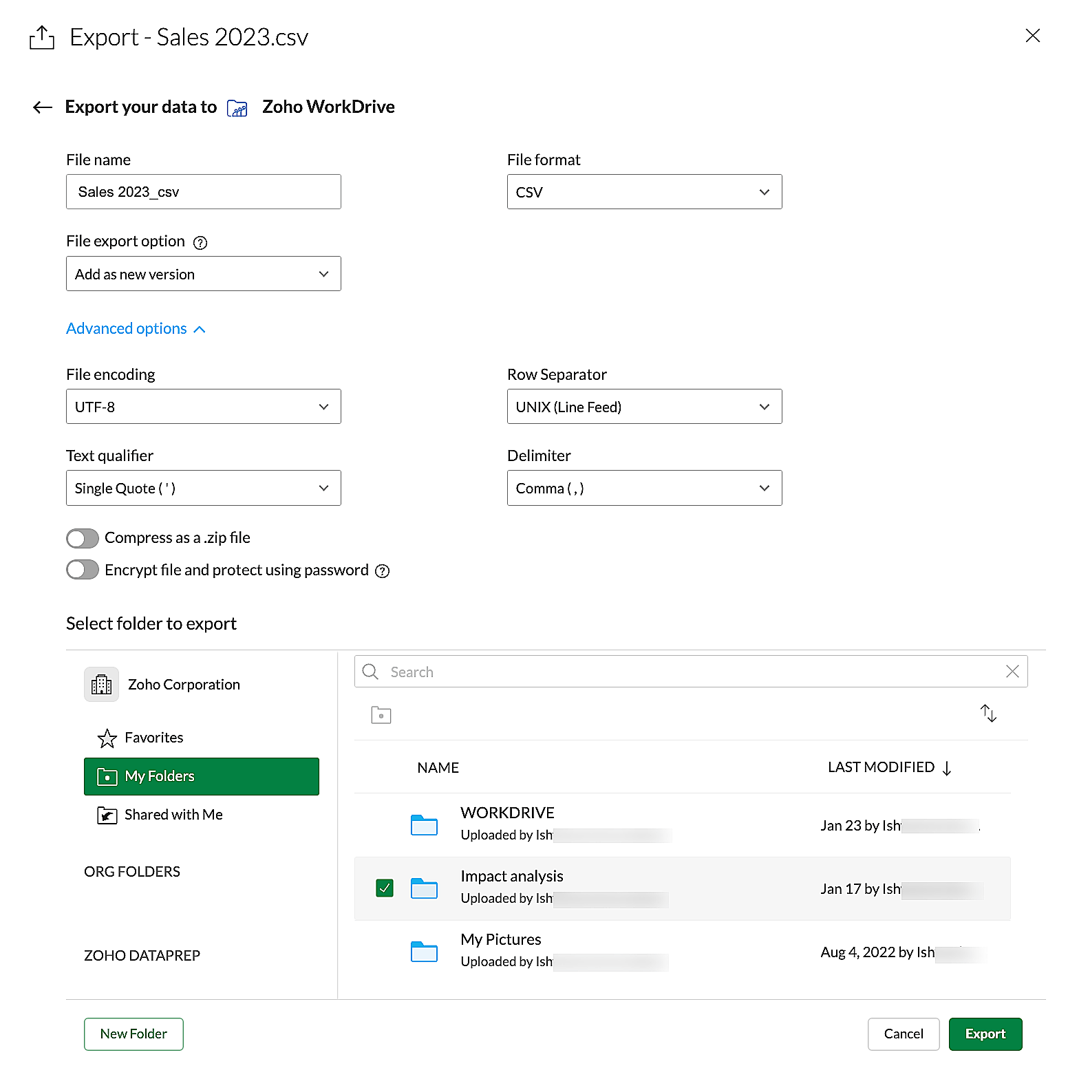 6. エクスポート可能なフォルダーは、Zoho DataPrepにログインしているZoho WorkDriveアカウントから直接取得されます。エクスポート先のフォルダーを選択してください。また、新規フォルダーを作成することも可能です。