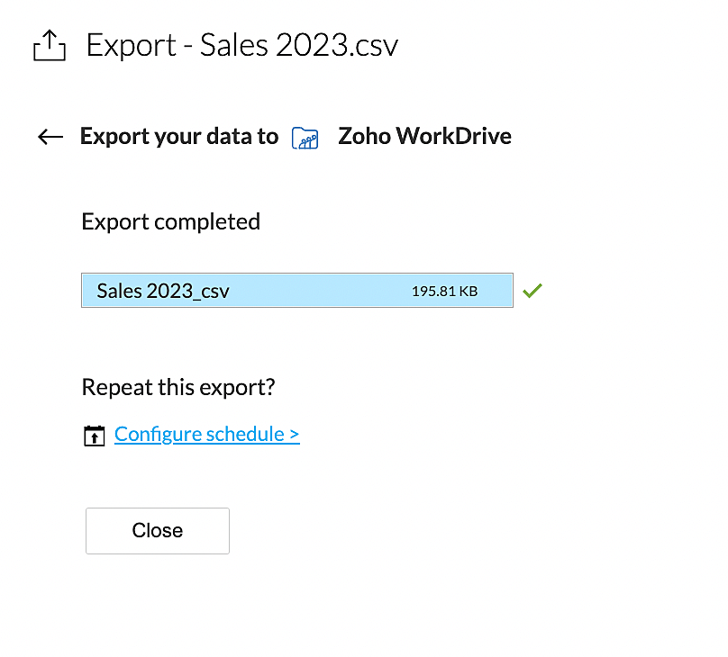 Zoho DataPrepは、人気のクラウドストレージサービスであるZoho WorkDriveへのデータエクスポートに対応しています。Zoho WorkDriveを利用することで、ファイルを安全にクラウド上で保存し、共同作業が可能です。