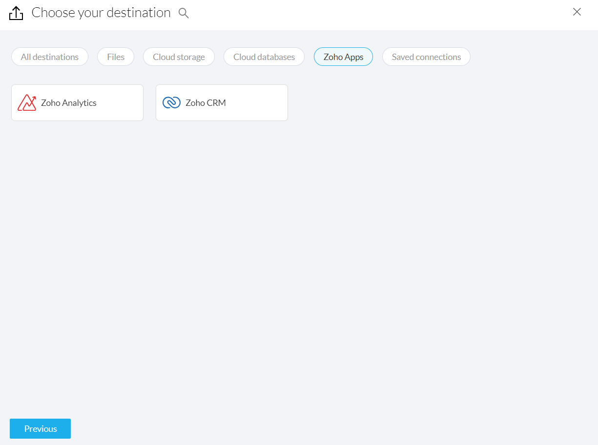 2. すべての宛先タブでZoho Analyticsを検索するか、Zohoアプリカテゴリーでフィルターし、該当項目をクリックします。