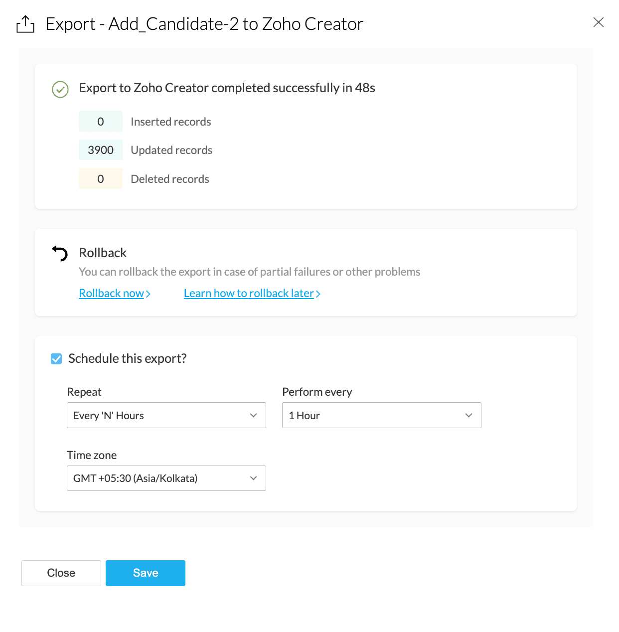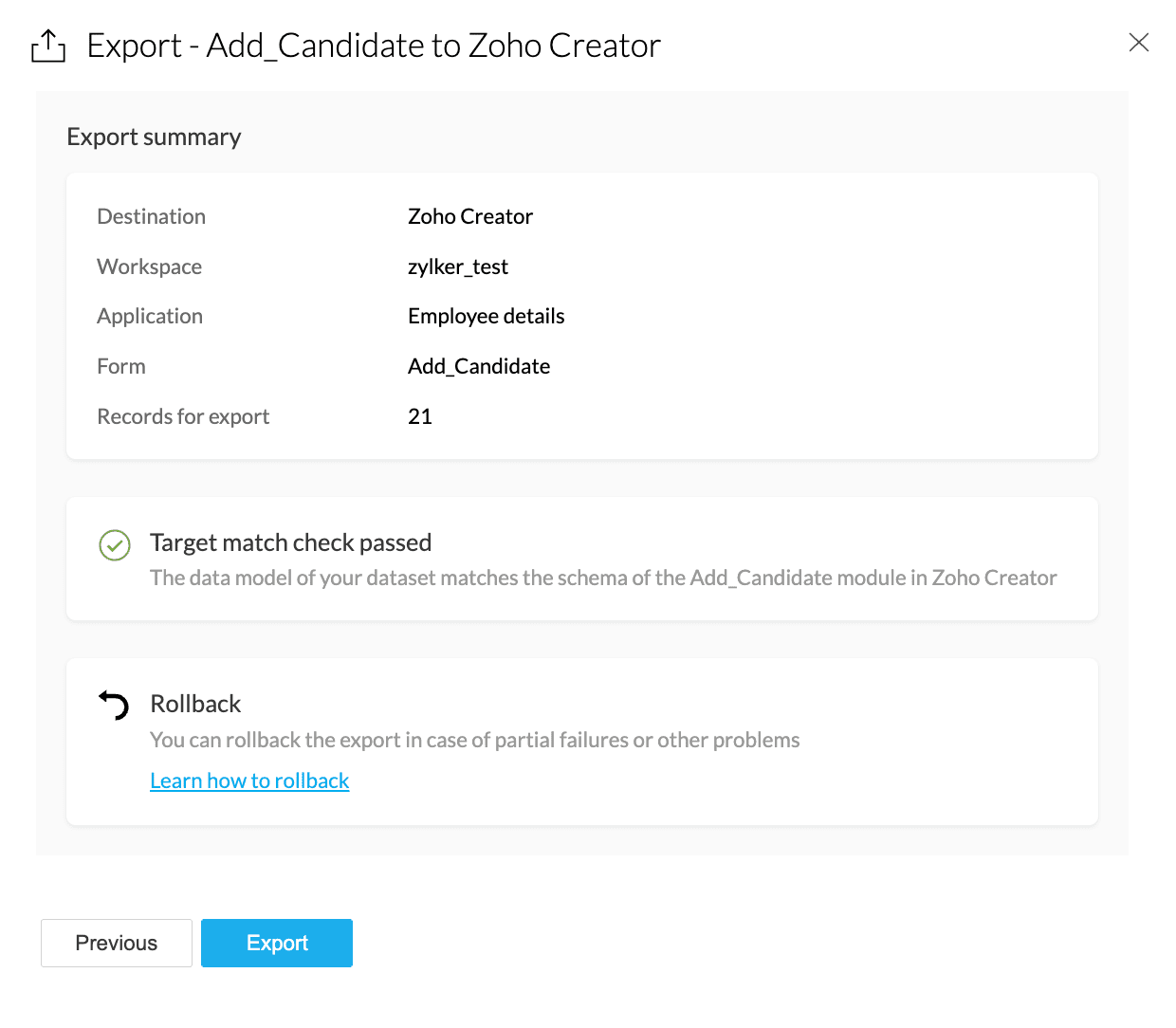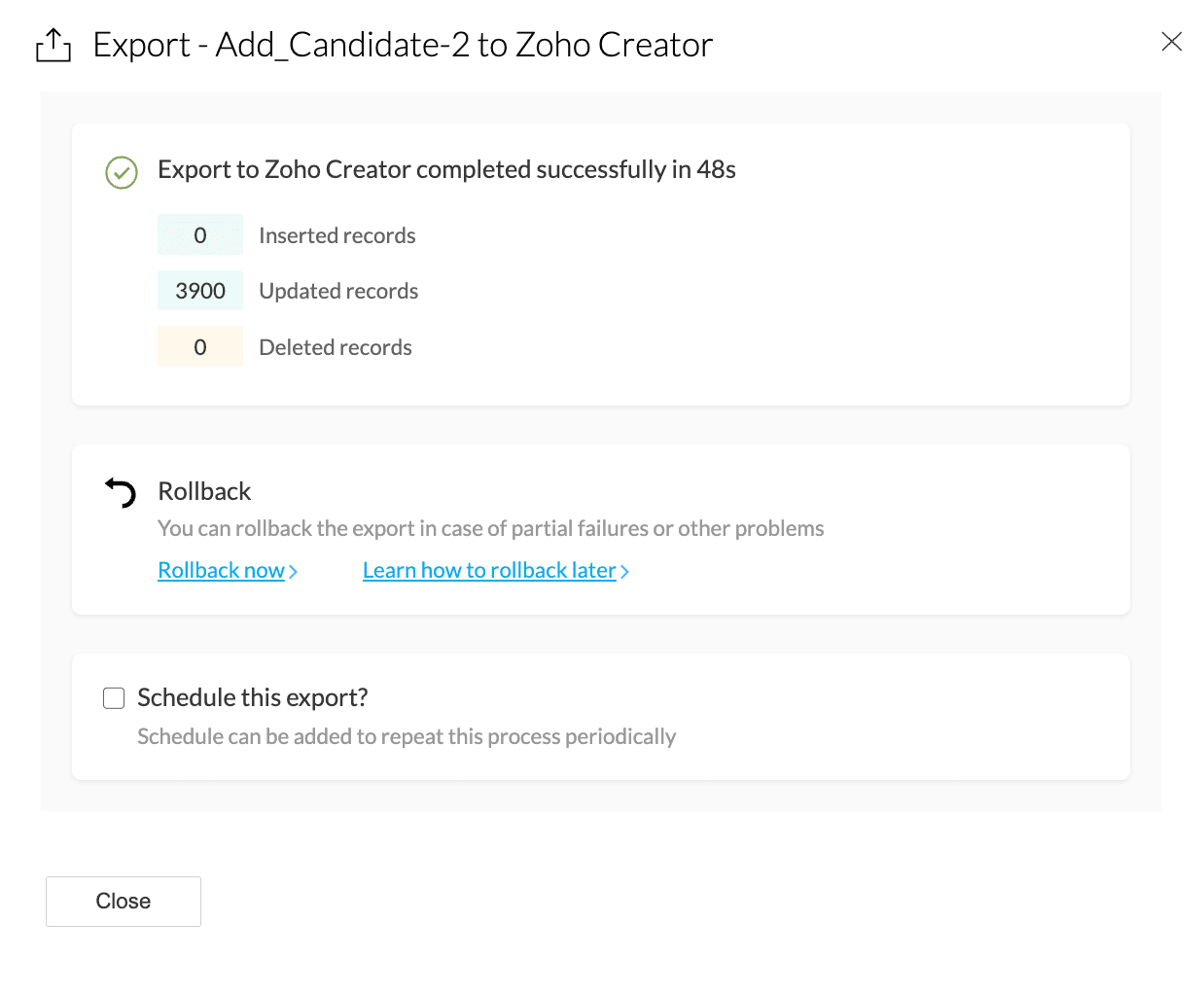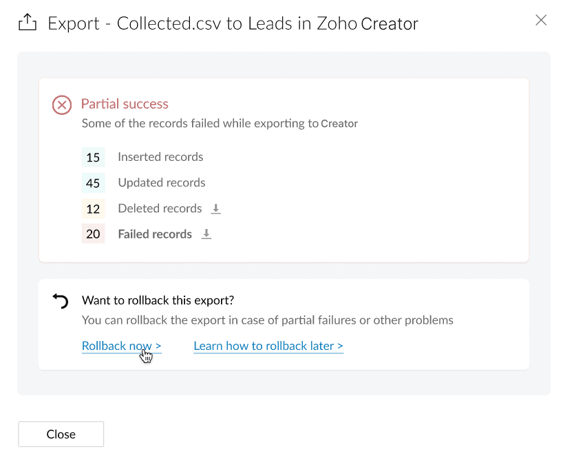 8. エクスポートするが一部失敗した場合、Zoho Creator フォームに適用済みの変更を元に戻すかキャンセルするには、今すぐロールバック機能を利用できます。また、成功したエクスポートするでも、ご希望の場合はロールバックが可能です。ロールバックの詳細については、次のセクションをご参照ください。