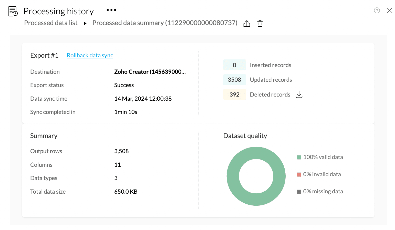 8. 対象のエクスポートのRollback data sync リンクをクリックすると、そのエクスポートによってZoho Creatorへ反映された更新をロールバックできます。