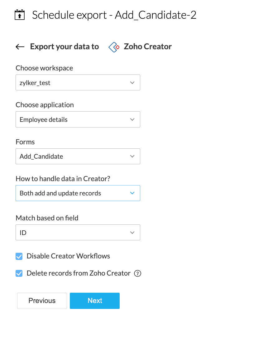 4. 下記のいずれかの設定を選択し、Zoho Creatorへエクスポートされるデータの処理方法を決定します。