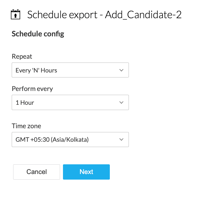 3. Schedule configセクションで、繰り返し方法(頻度「N」時間、頻度day、週1回、月1回)を選択します。Perform 頻度オプションで繰り返すタイミング(頻度)とタイムゾーンを設定してください。