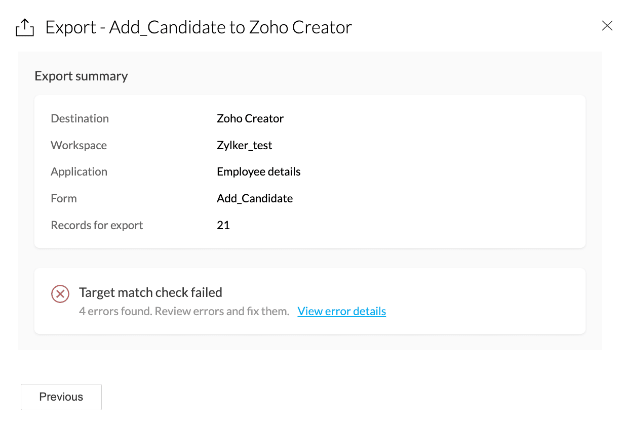 1. Zoho Creator でエクスポート時に Target照合チェックが失敗した場合、エラーの詳細を表示リンクをエクスポート概要パネルからクリックすると、エラーの概要を確認できます。