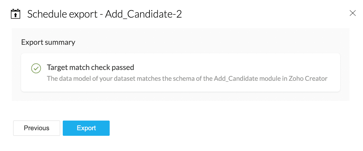 9. ターゲット照合チェックに失敗した場合は、ターゲットマッチング の手順を完了してエラーを修正する必要があります。ターゲット照合チェックに合格した場合は、Zoho Creator へのデータエクスポートを続行できます。
