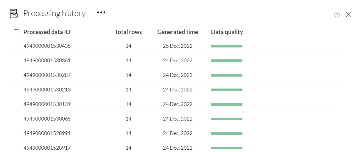 3. 処理履歴オプションをクリックすると、サイドパネルが開き、そのデータセットで利用可能なすべての処理済みデータIDと作成日時が表示されます。