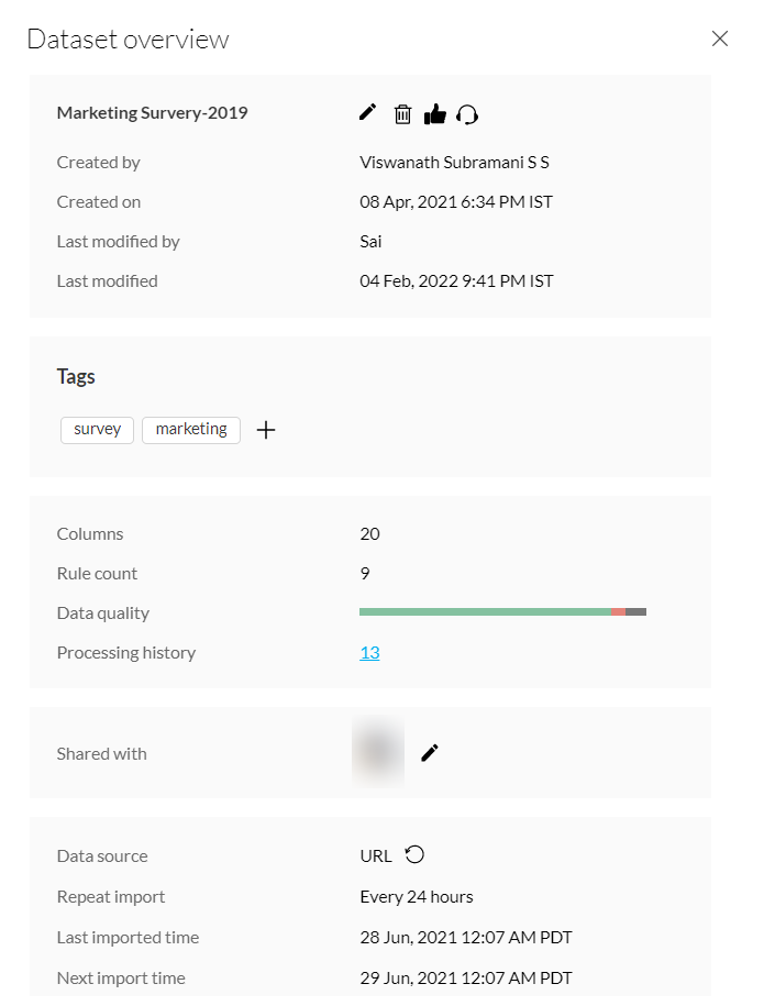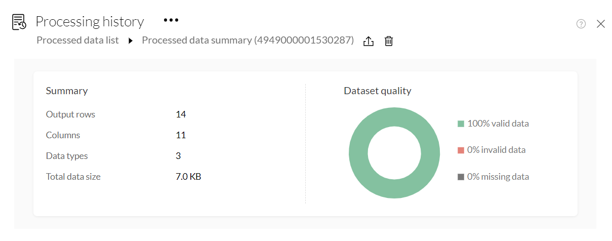 4. 必要な処理済みデータのリストをクリックすると、概要、処理済み行数、データセット品質、列の詳細などが表示されます。