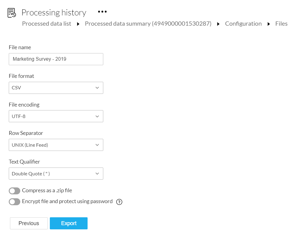 データセットのエクスポートが完了すると、エクスポート済みデータのコピーが監査目的でDataPrepの処理履歴に保存されます。処理済みデータをファイルとしてエクスポートすることも可能です。