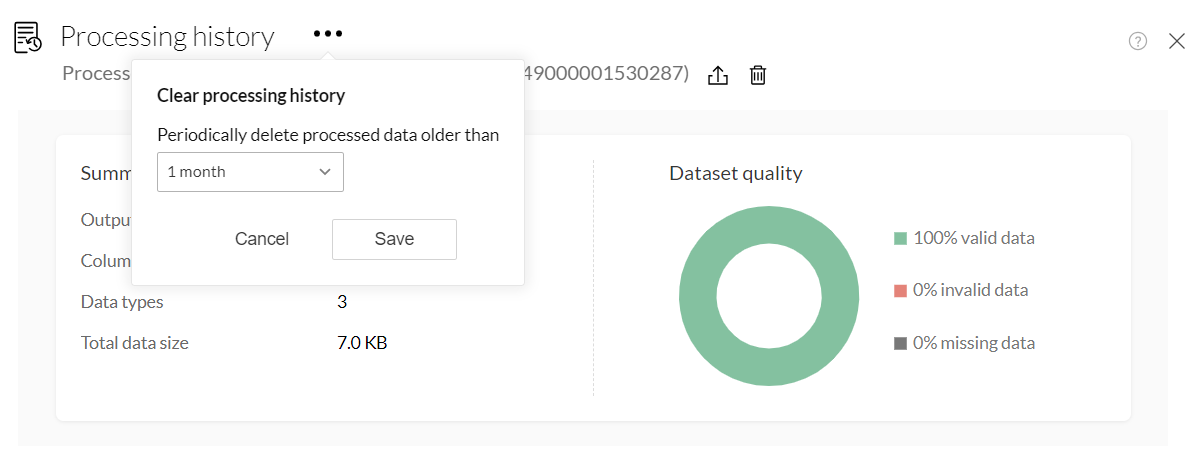 Notes メモ : DataPrepでアカウント管理者または組織管理者の場合、組織内のすべてのデータセットの処理済みデータを、設定ページ > 処理履歴のクリアからクリアできます。