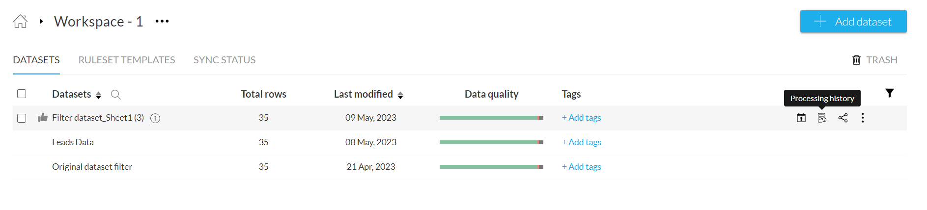 2. または、Workspace詳細ページのDatasetsタブでデータセットにカーソルを合わせた際に表示される処理履歴アイコンを選択することもできます。