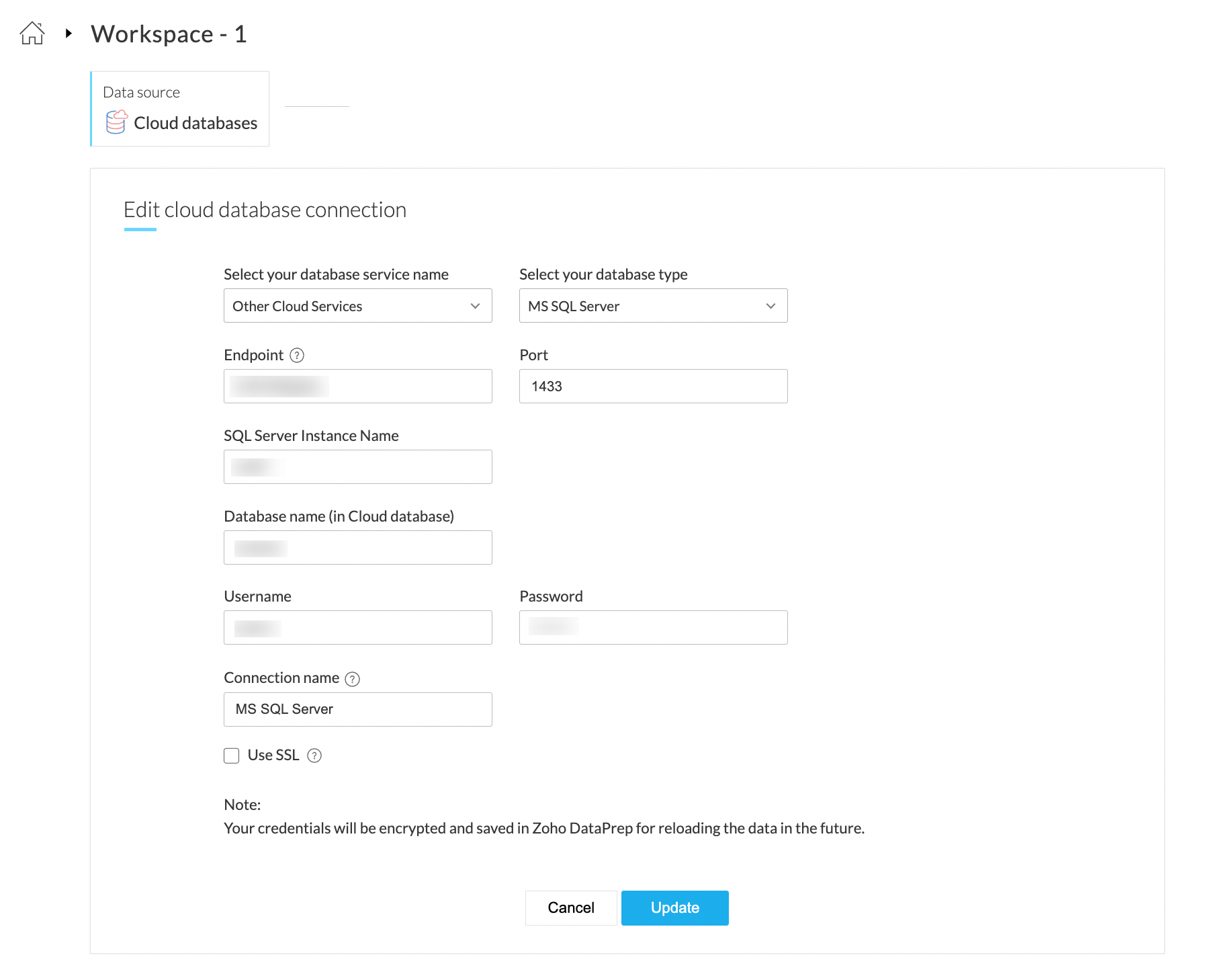 3. データベース接続の認証のため、Endpoint、Port、SQL Server Instance 名前、Database 名前、ユーザー名、およびパスワードを入力します。