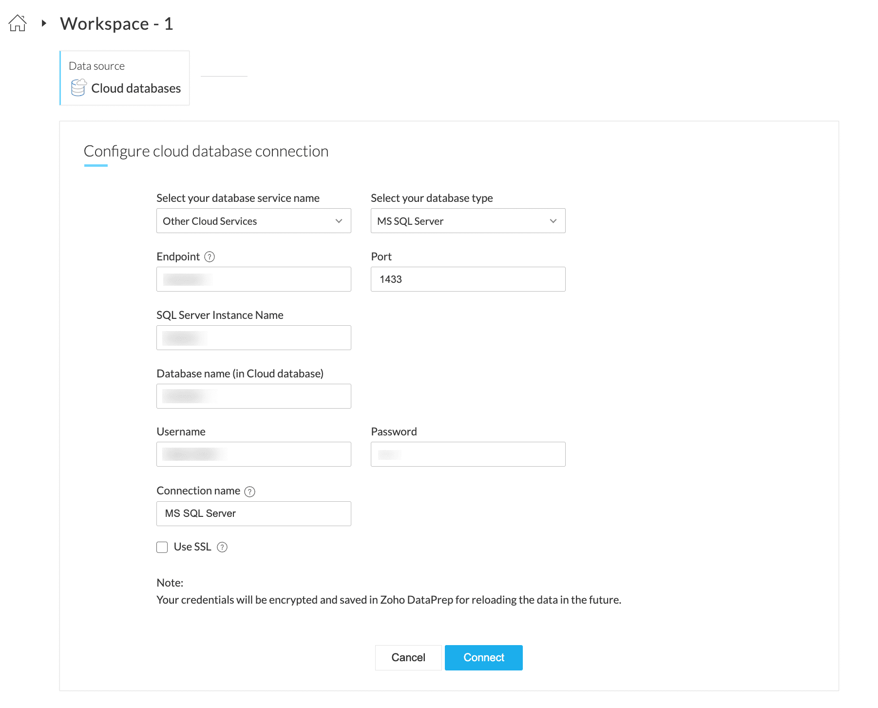 5. データベースサーバーがSSL経由で暗号化データを提供するよう設定されている場合は、使用する SSLチェックボックスを選択することもできます。