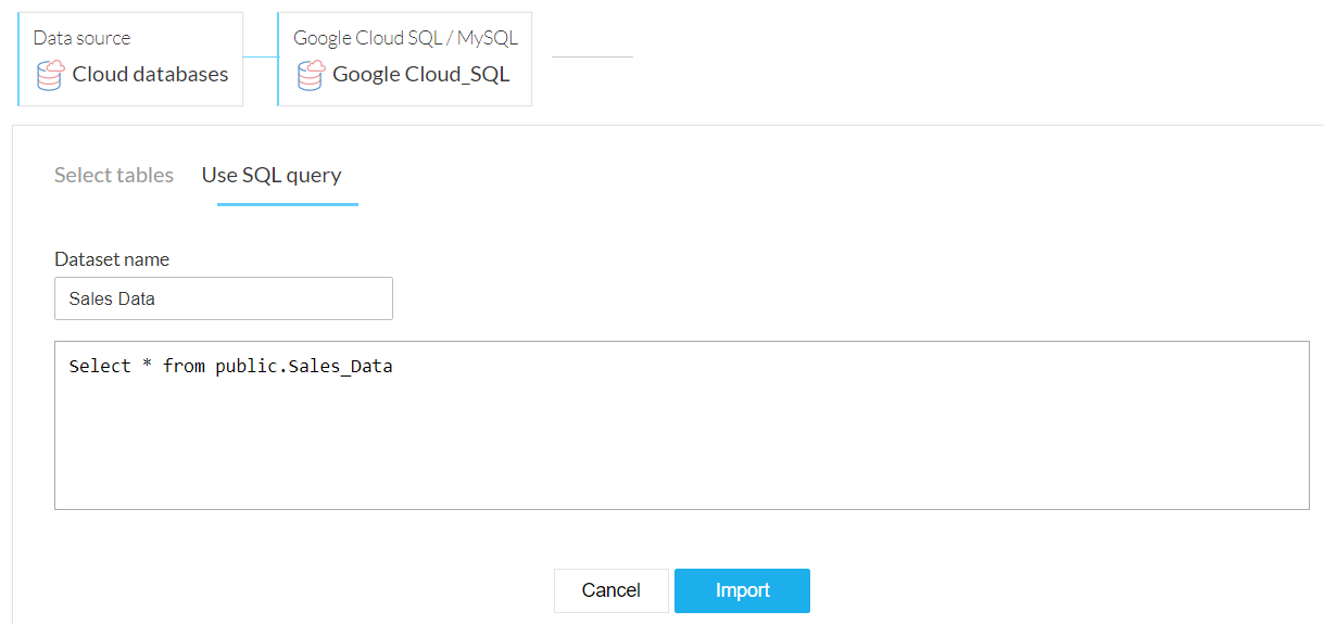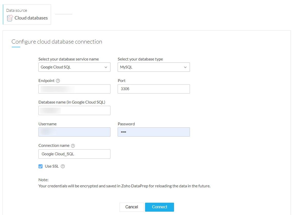 Zoho DataPrepでは、Google Cloud SQLというクラウドデータベースからデータをインポートできます。これは、Google Cloud Platform上でリレーショナルデータベースのセットアップ、保守、管理、運用をサポートするフルマネージド型のデータベースサービスです。