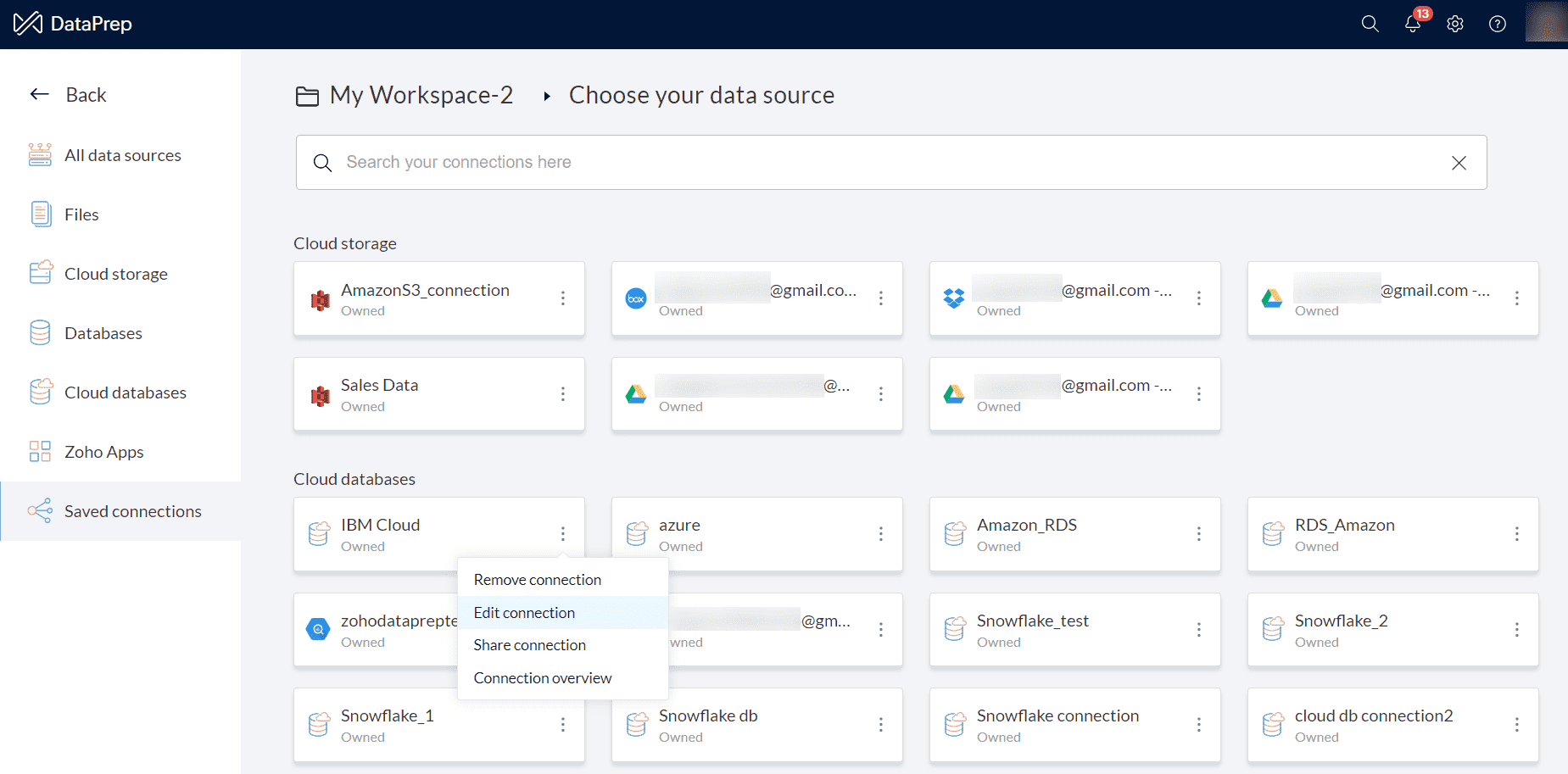 DataPrepは、外部連携情報を保存しており、接続先や保存先ごとに毎回認証情報を入力する手間を省けます。保存済みデータ連携は、いつでも編集して新しいパラメーターや認証情報に更新できます。編集オプションを利用してください。
