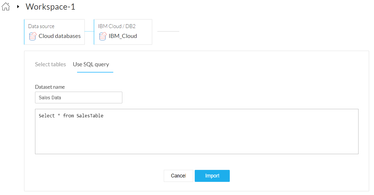 Notesメモ: 既に IBM Cloud - DB2 の接続を追加済みの場合は、Saved 外部連携カテゴリから該当する接続を選択し、インポートを続行してください。Saved 外部連携の詳細については、こちらをクリックしてください。