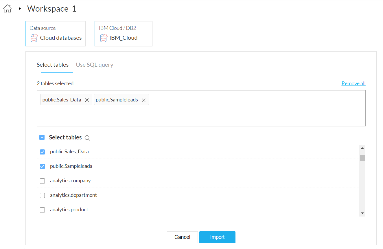 Zoho DataPrep を使用すると、IBM Cloud というクラウドデータベースにデータをエクスポートできます。IBM Cloud のデータベースソリューションは、データおよび分析向けの充実したマネージドサービスを提供します。