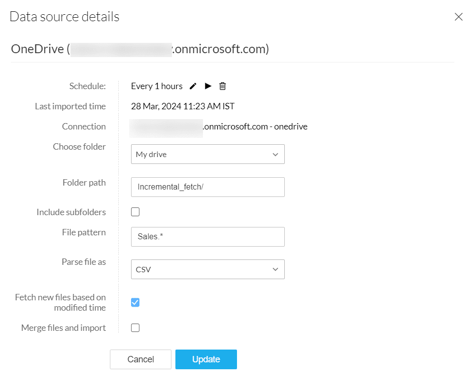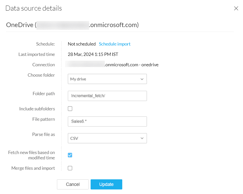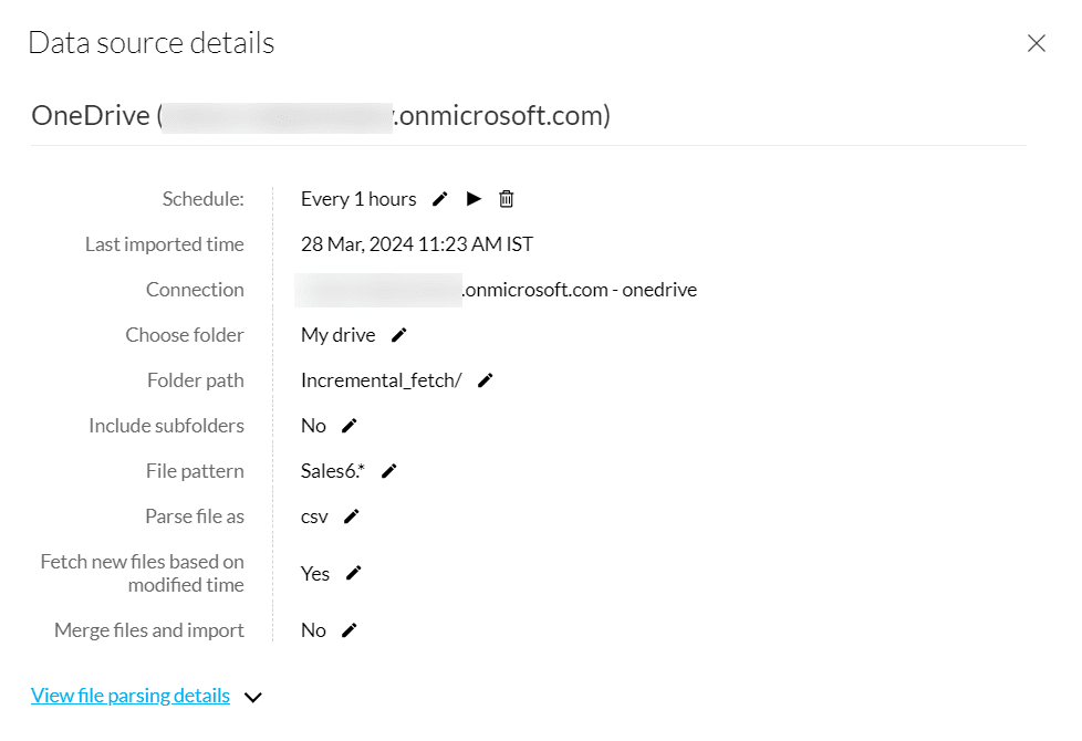 7. データセットのインポートがスケジュールされると、「imported 時間」または「last scheduled 時間」が記録されます。初回は最も古いファイルのみが取得されます。その後、同期が正常に完了するたびに「最後の同期日時」が新しい値で更新され、同期時間以降に作成または更新されたファイルがインポートされます。OneDriveに新規または更新済みファイルがない場合、データのインポートは行われません。データが同期されなかった場合でも、同期は試行されたため同期時間は更新されます。次回は、この同期時間以降に作成または更新されたファイルが取得されます。