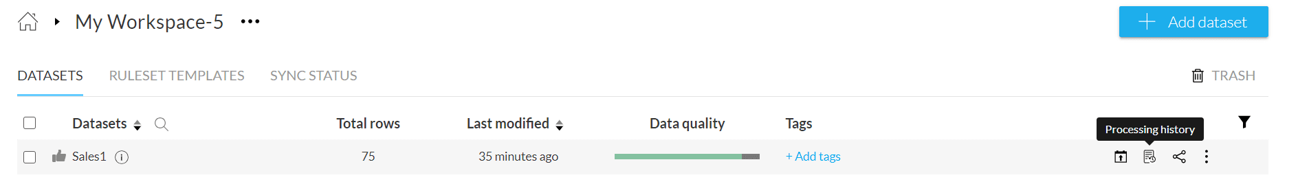 できることは、Processing 履歴パネルで頻度同期のために処理済みデータを認証することです。「Processing 履歴 」オプションをクリックすると、サイドパネルが開き、データセットで利用可能なすべての処理済みデータIDと作成日時が一覧表示されます。