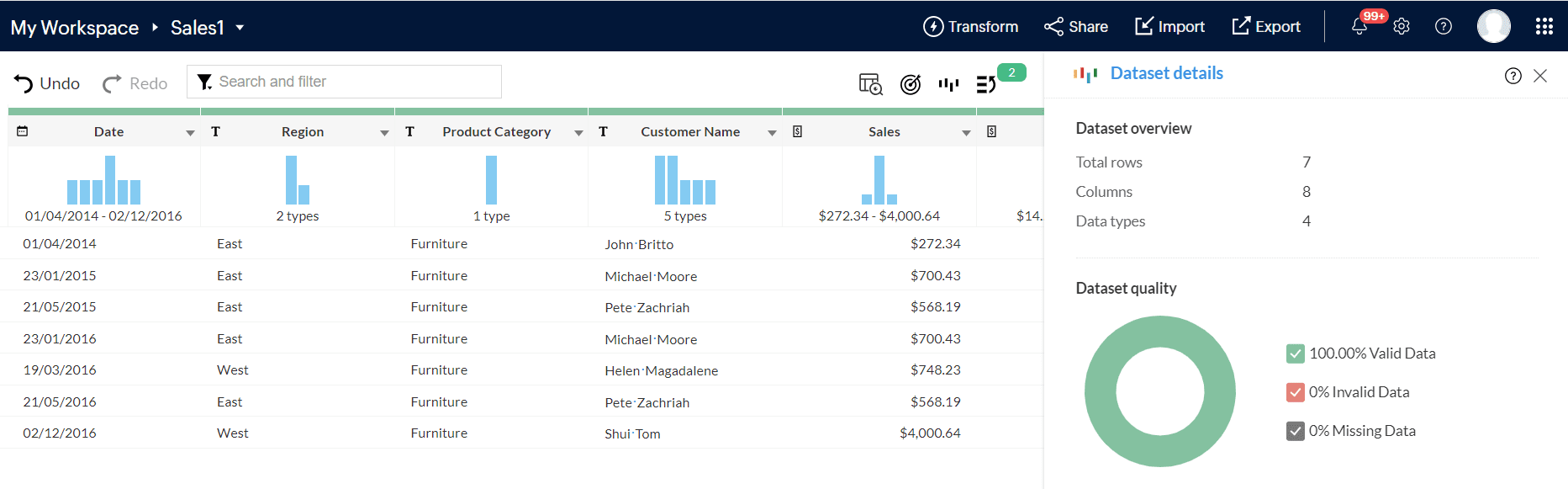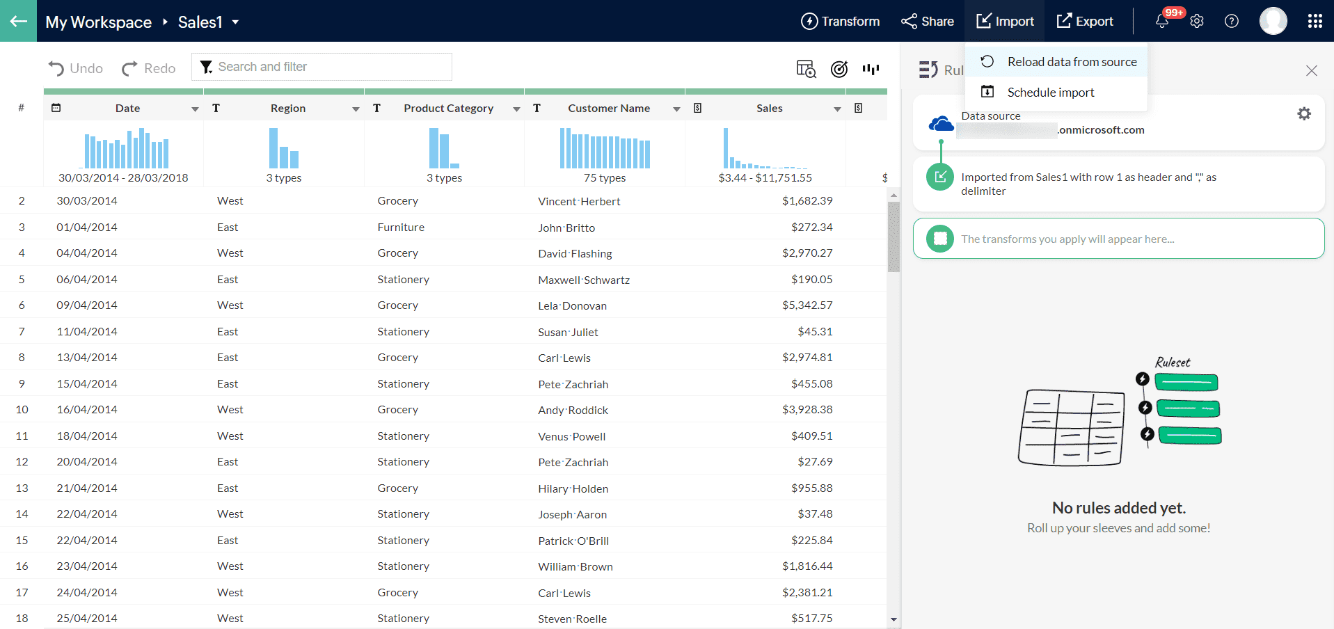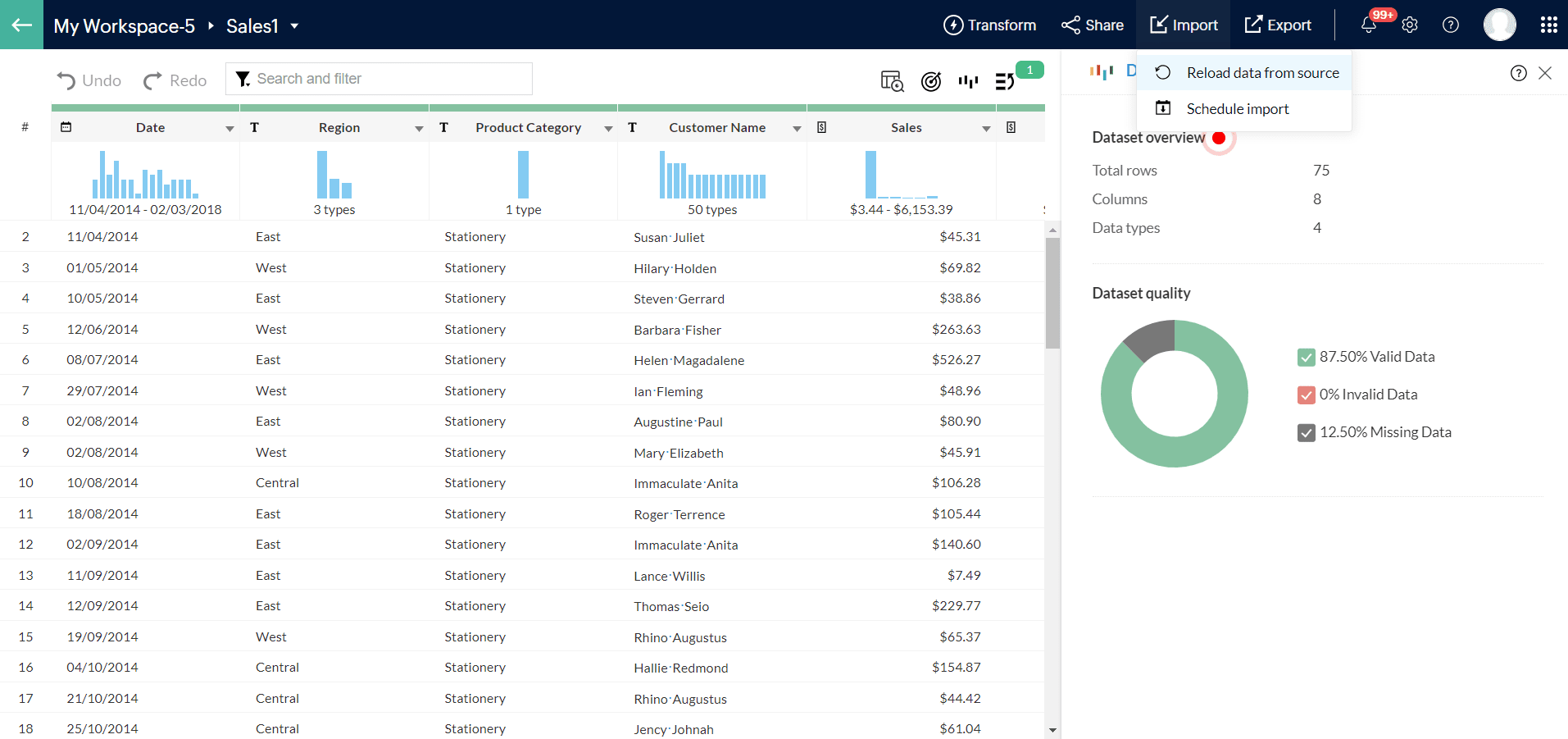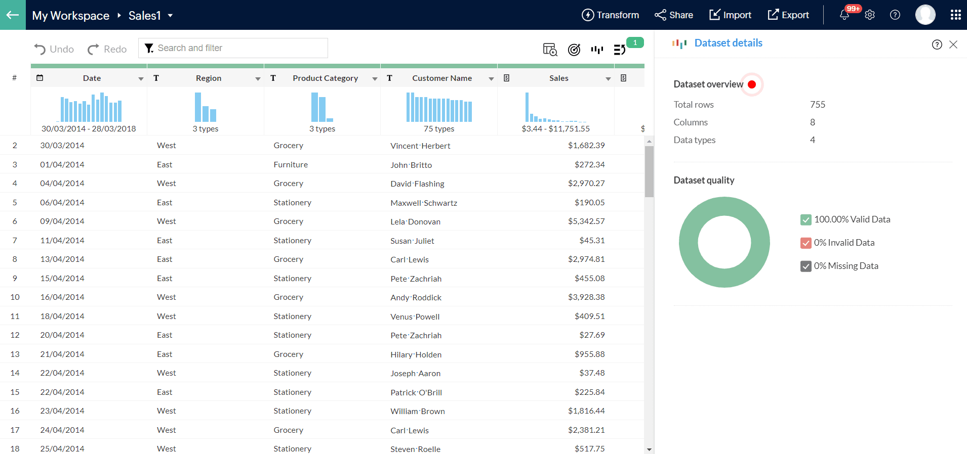 5. データのインポートが完了すると、データセットが開き、すぐにデータの準備を開始できます。