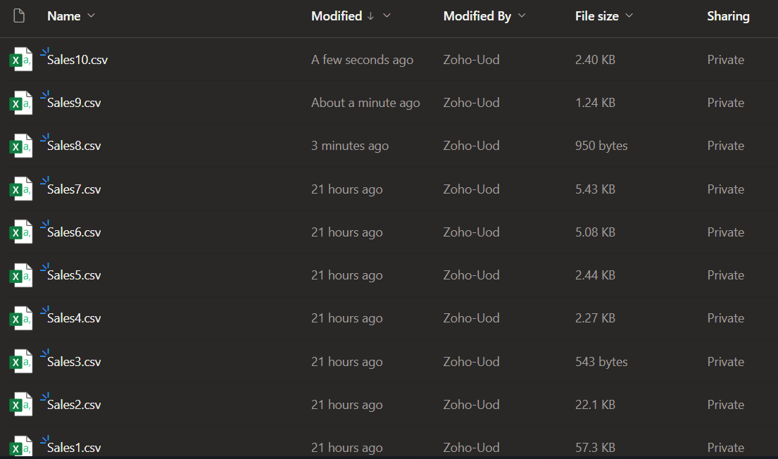 11) スケジュール設定後は、同じパターンの新しいファイルが、最後に同期された時間をもとに段階的に取得されます。たとえば、Sales7やSales8 などのファイルが順次インポートされ、通常間隔でエクスポートされます。