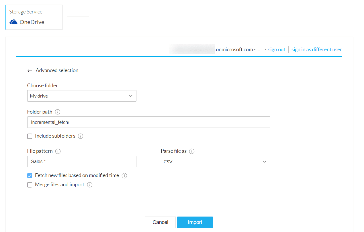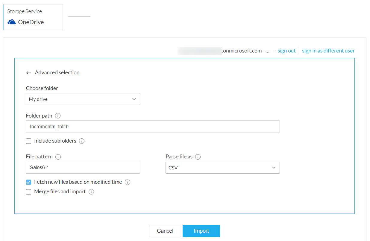 詳細選択では、正規表現に基づいた動的なファイル選択が可能です。これにより、OneDrive アカウントから新規または増分データの取得が行えます。ファイルパターンに一致する新規追加または更新されたファイルは、前回の同期以降にOneDrive アカウントから取得されます。