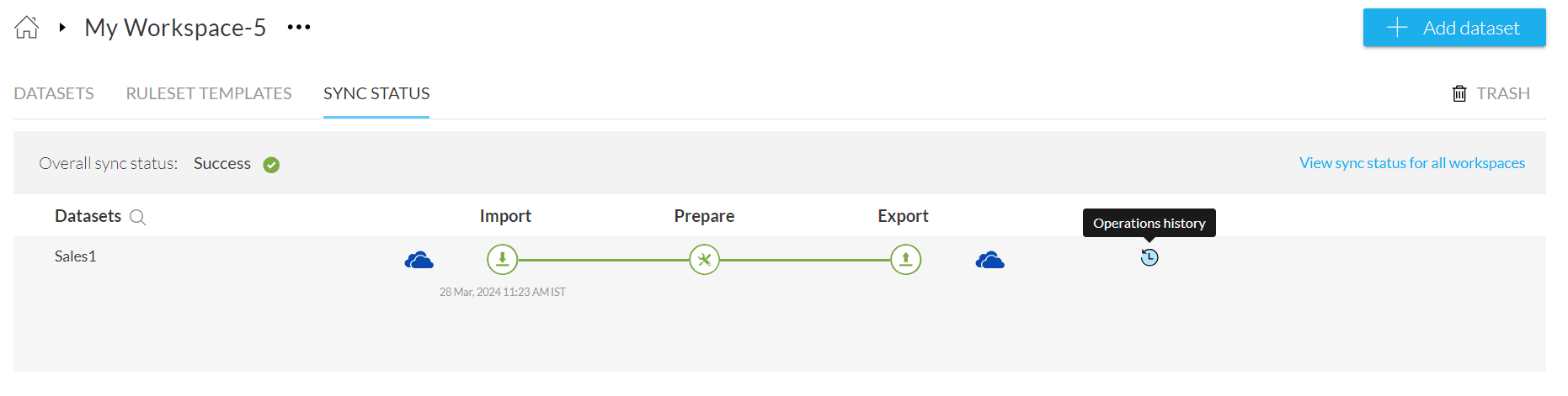 各syncステータスの横にあるOperations 履歴アイコンをクリックすると、データセット、以前の状態、インポート・エクスポートのスケジュールに対して実施された変更をタイムライン形式で表示・追跡できます。