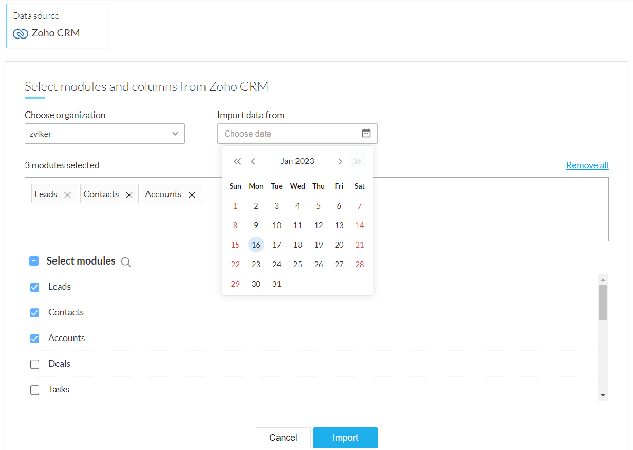 スケジュールインポートオプションを利用して、データインポートをスケジュールできます。また、Zoho CRMインポートをスケジュールする際に、CRMから増分データのみインポートすることも可能です。増分データインポートは、前回の同期以降に追加または更新されたデータのみをインポートする方法です。