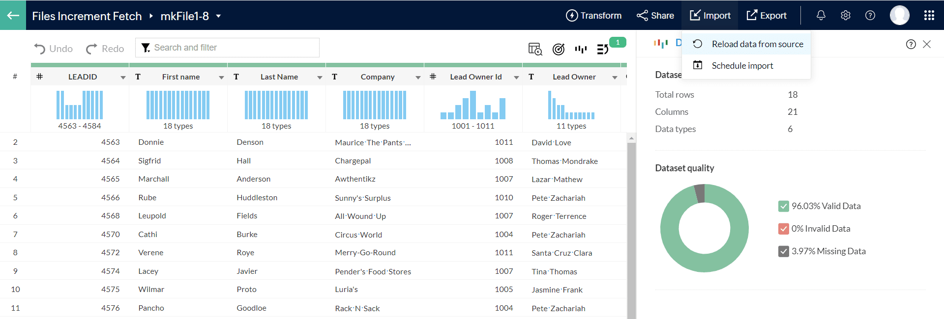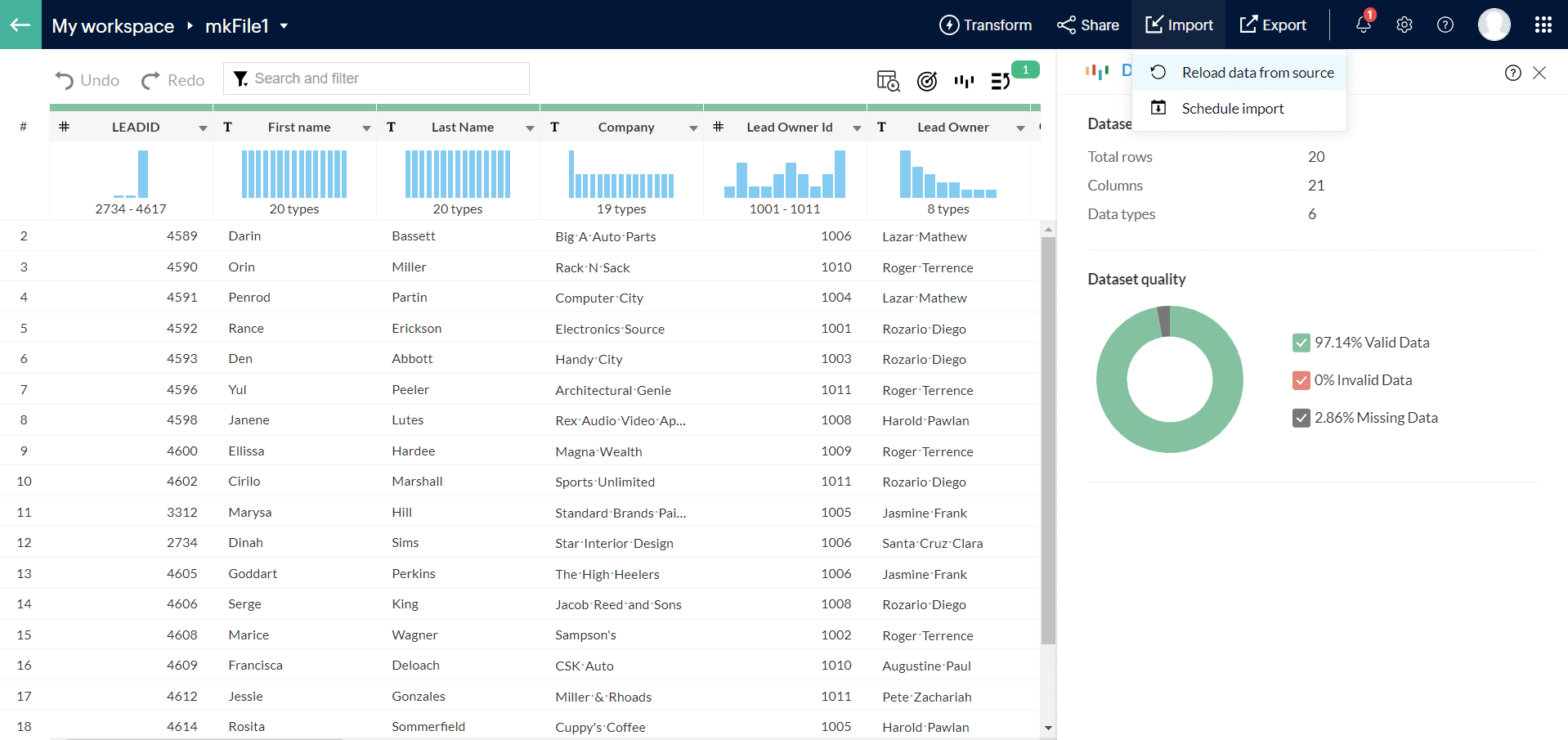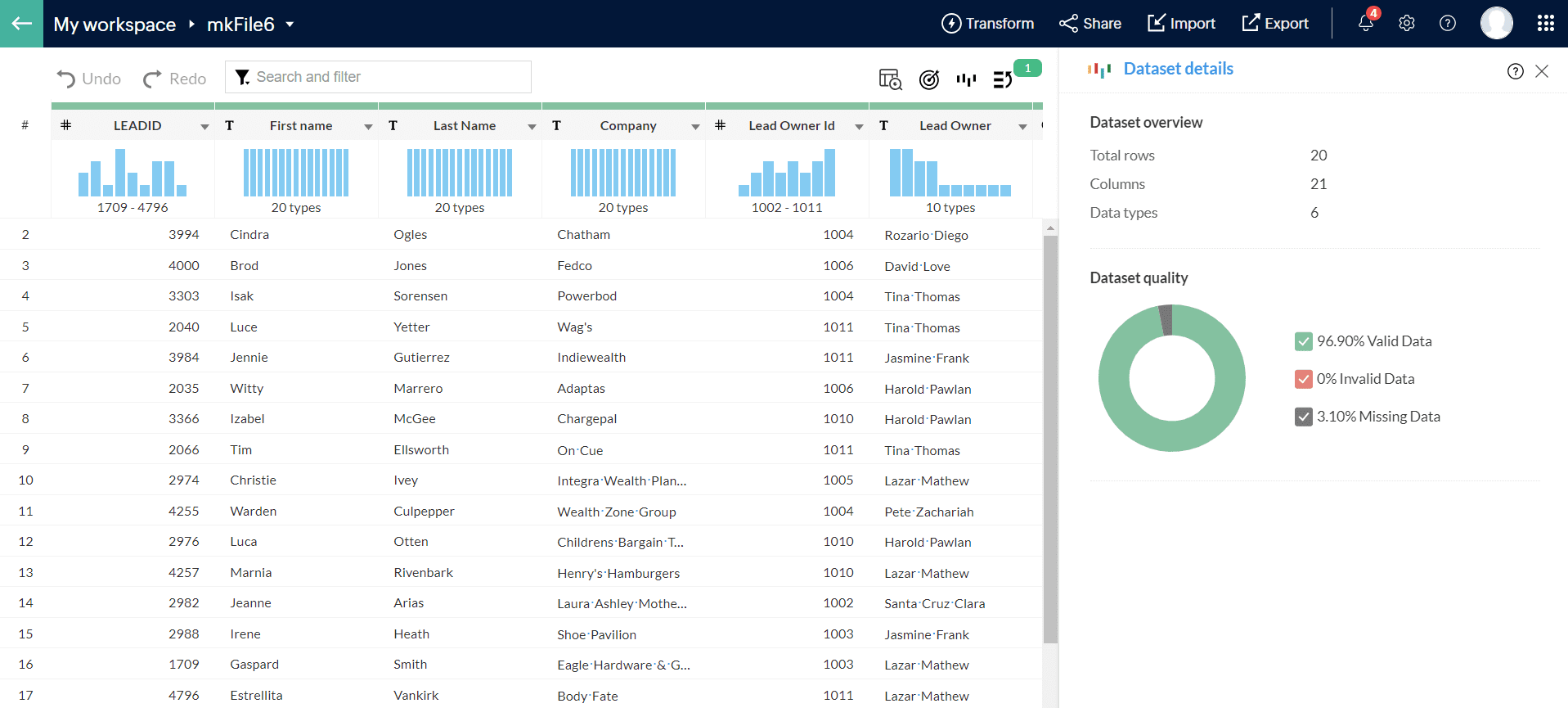 5. インポートするボタンをクリックします。データのインポートが完了すると、データセットが開き、すぐにデータの準備を開始できます。