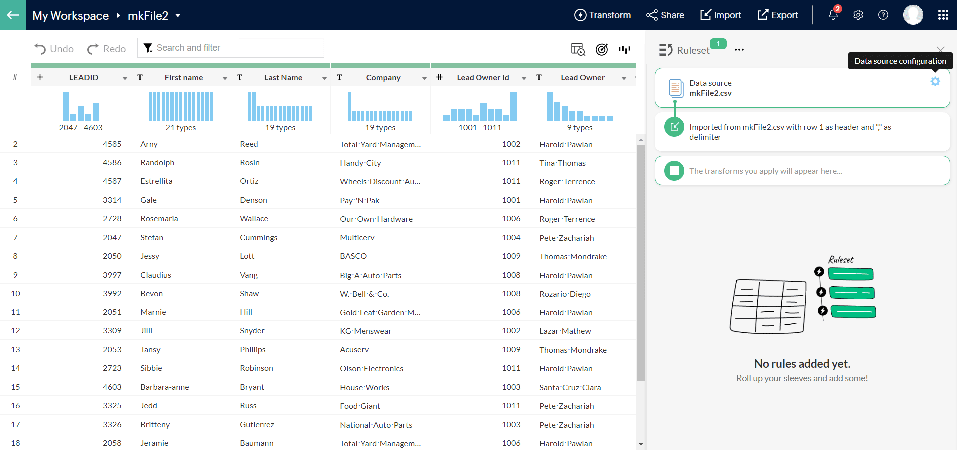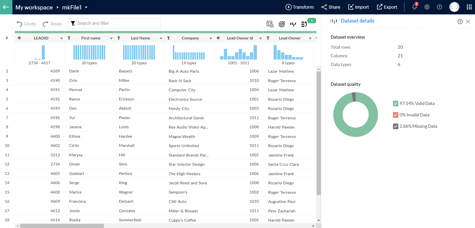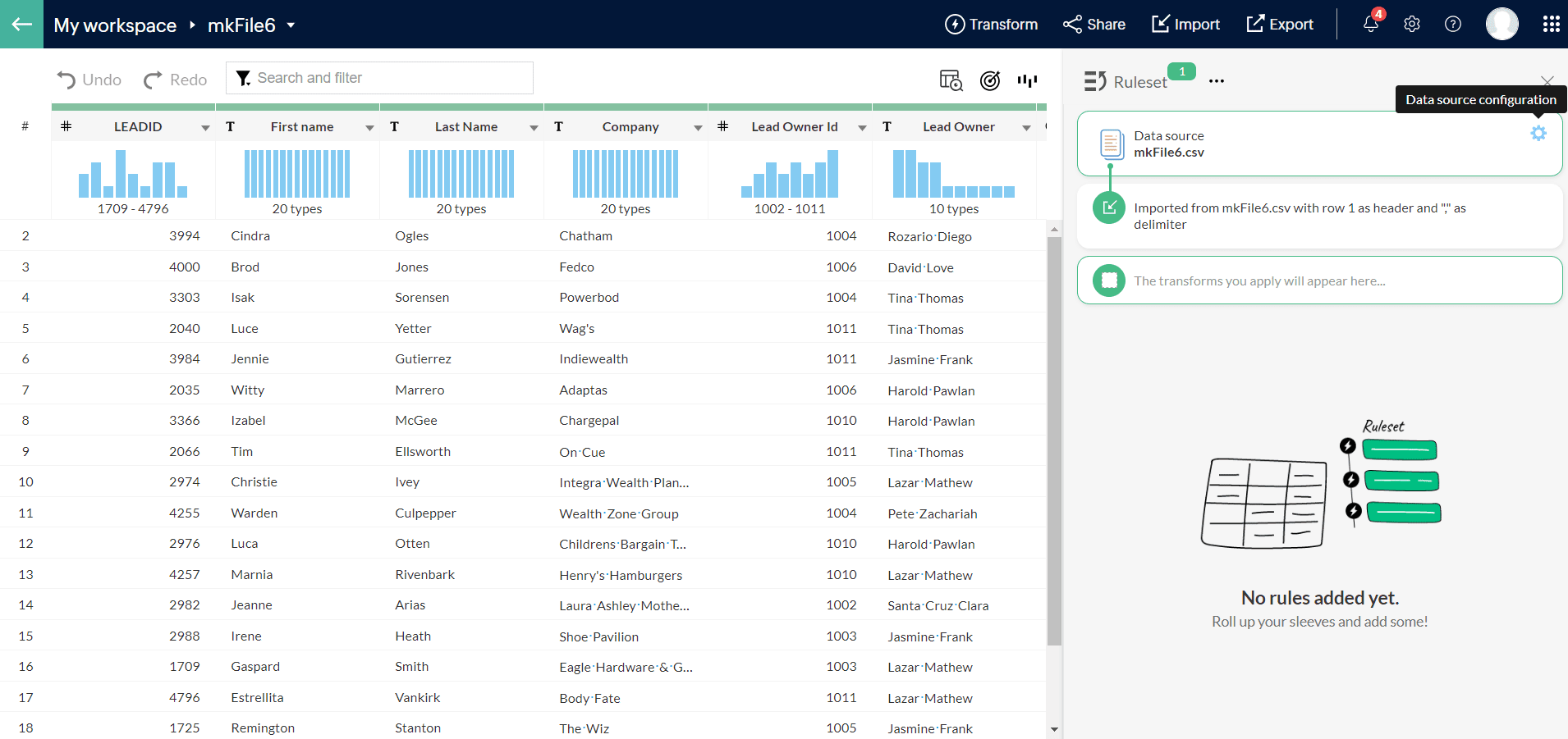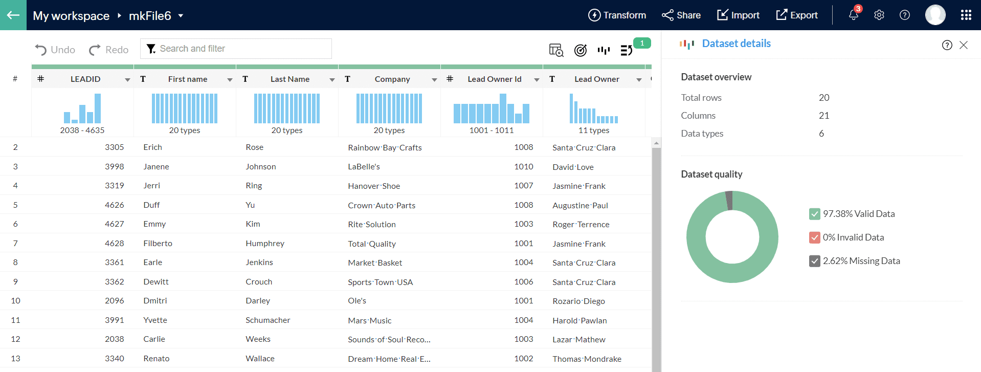5. インポートするボタンをクリックします。データのインポートが完了すると、データセットが開き、すぐにデータの準備を開始できます。