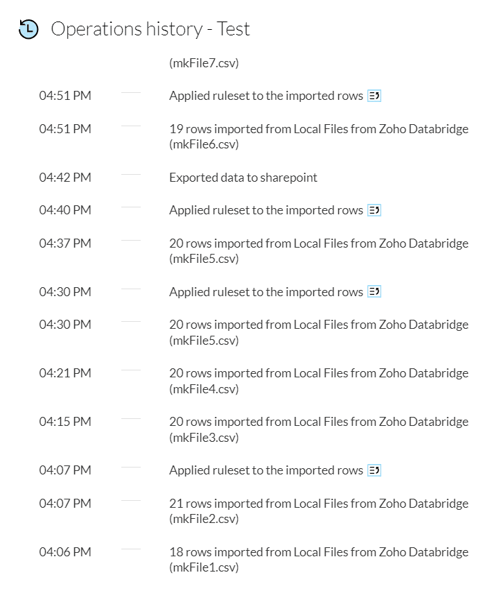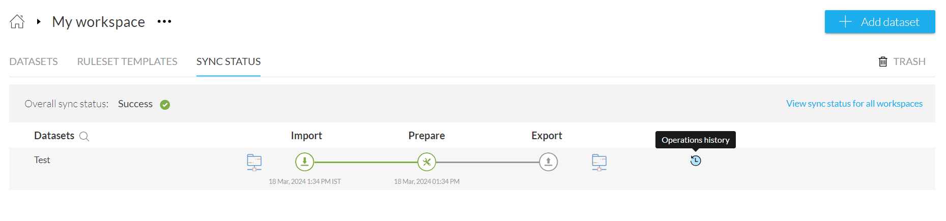 各syncステータスの横にあるOperations 履歴アイコンをクリックすると、データセットに対して行われた変更や、過去の都道府県、インポートする・エクスポートするスケジュールをタイムラインで表示・追跡できます。