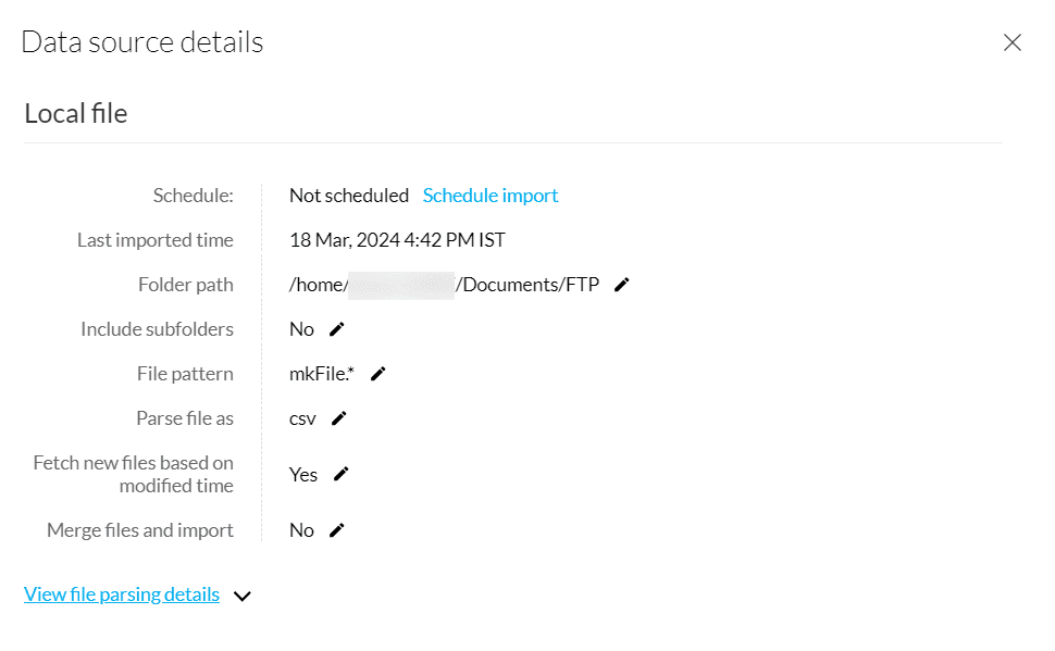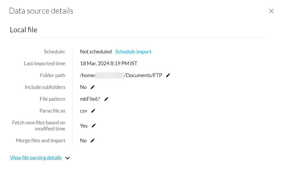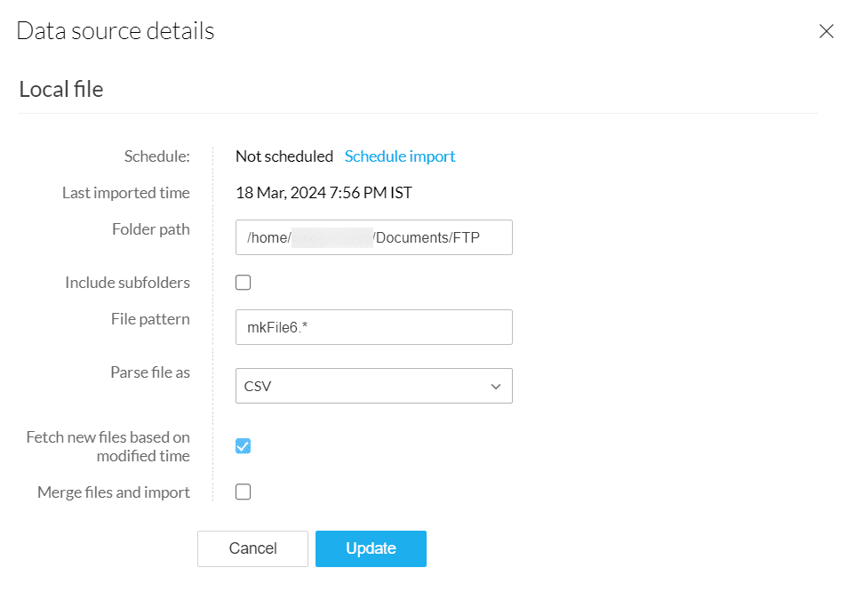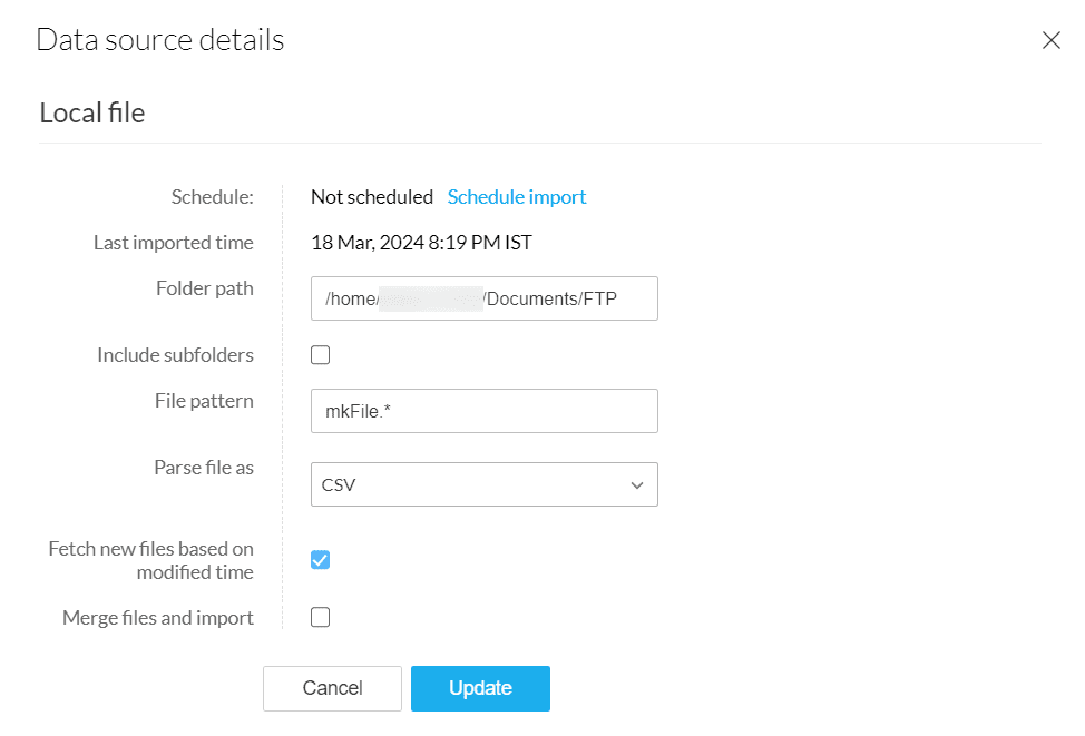 7. データセットのインポートがスケジュールされると、インポート時刻または前回のスケジュール時刻が記録されます。最初は最も古いファイルのみが取得済みとなります。各同期が正常に完了するたびに、最後の同期日時が新しい値で更新され、その時刻以降に作成または更新されたファイルがインポートされます。指定した場所に新規または更新済みのファイルがない場合は、データはインポートされません。データが同期されなかった場合でも、同期が試行されたため同期時刻は更新されます。次回はこの同期時刻以降に作成または更新されたファイルが取得されます。