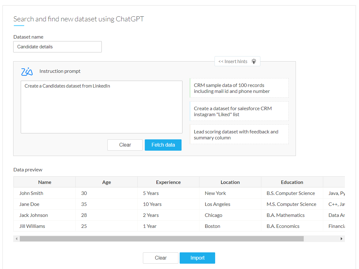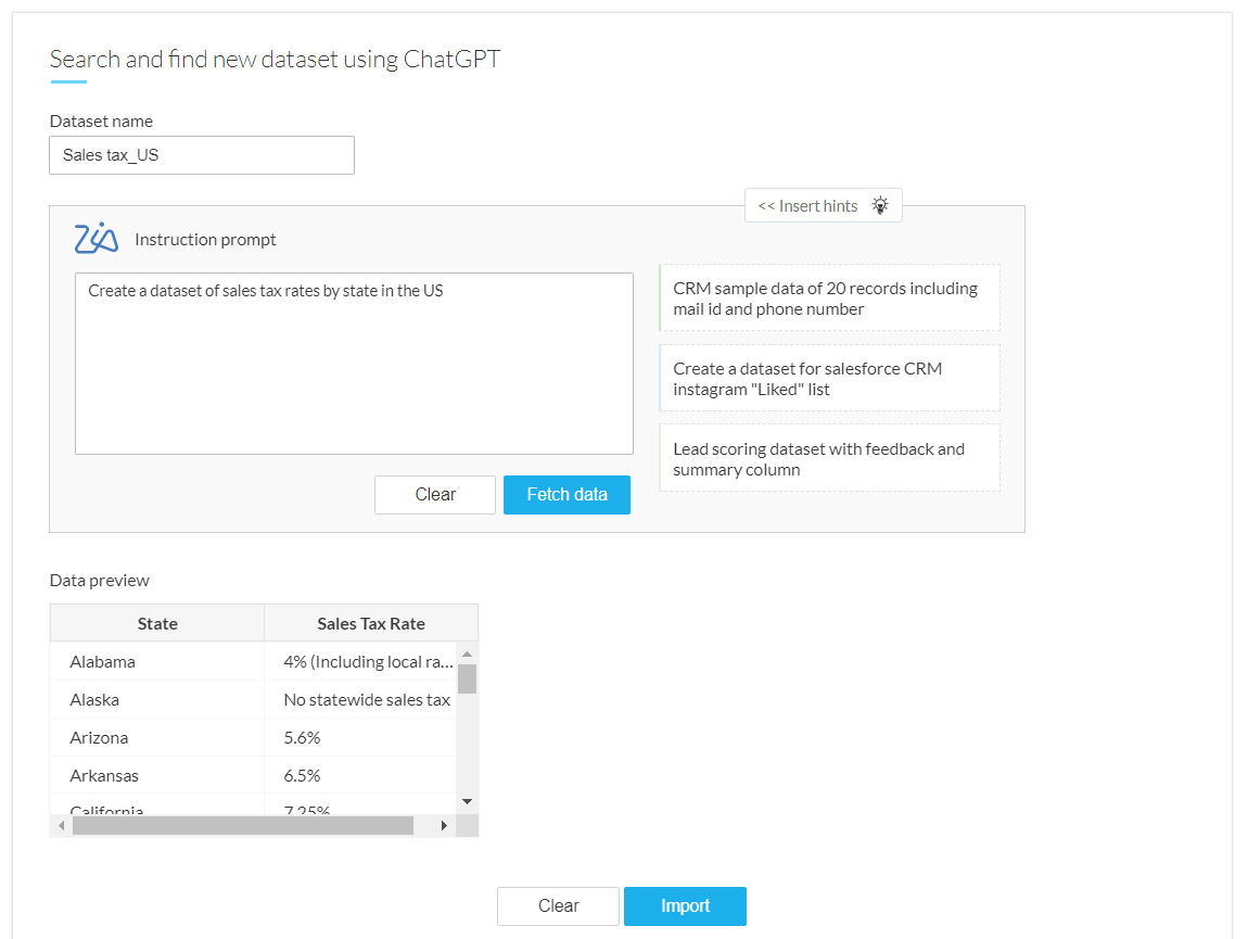 Zoho DataPrepは、OpenAIが開発した生成AIであるChatGPT APIとの連携により、要件に基づいて新規データセットを検索し、データの充実化を支援します。これらのデータセットをデータエンリッチメントの目的で利用できます。この機能をDataPrep組織で有効にするには、設定ページのOpenAI Integrationタブに移動してください。こちらをクリックして、OpenAI連携機能の有効化について詳しくご覧いただけます。