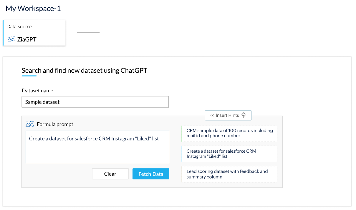 3.インストラクションプロンプトに、取得したいデータの種類についてヒントを入力します。例として、Salesforce CRMのInstagram「いいね」リストのデータセットを作成する、といった指定が可能です。ヒントを挿入セクションからプロンプトを挿入することもできます。