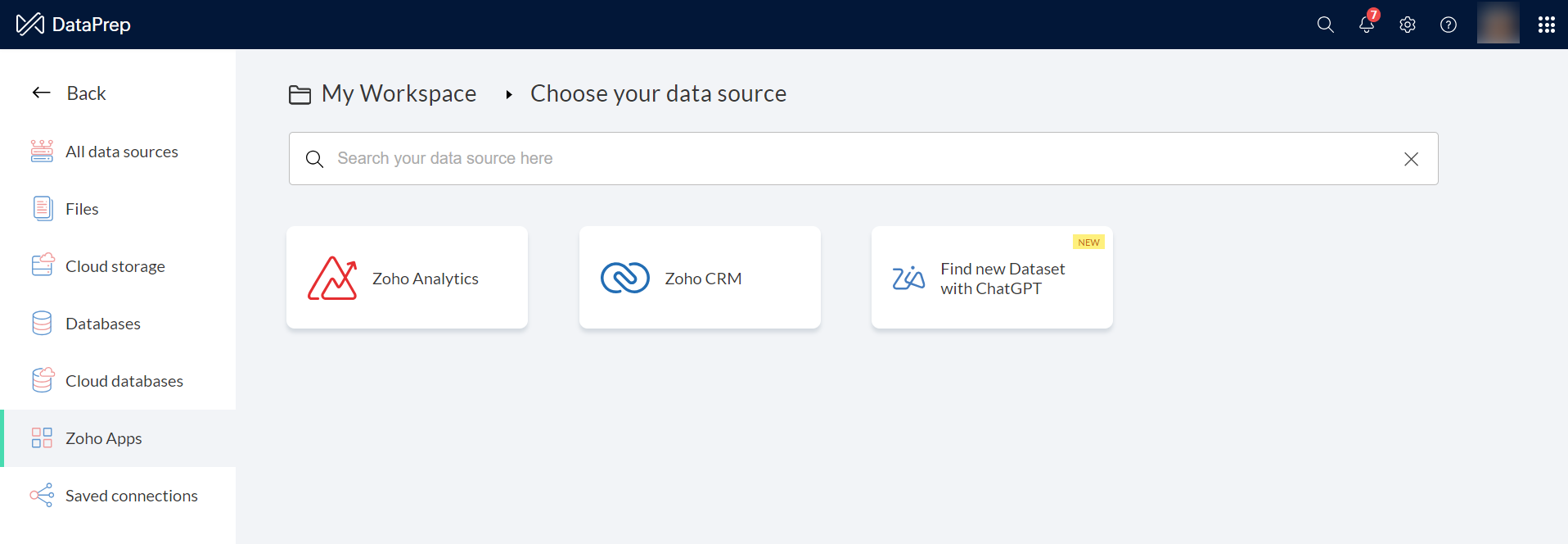 2. 左側のペインからZohoアプリカテゴリを選択し、ChatGPTで新規データセットを検索をクリックします。また、検索ボックスで直接このオプションを検索することもできます。