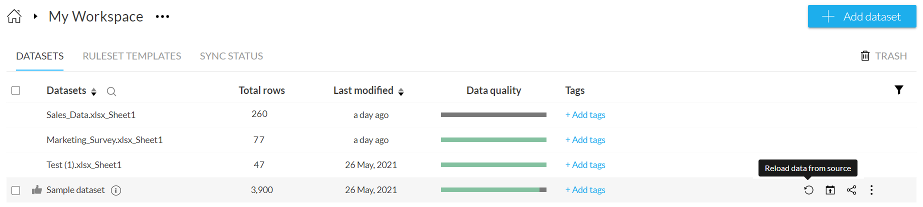 2. データ元からデータを更新アイコン は、ワークスペース詳細ページのデータセットタブにあります。