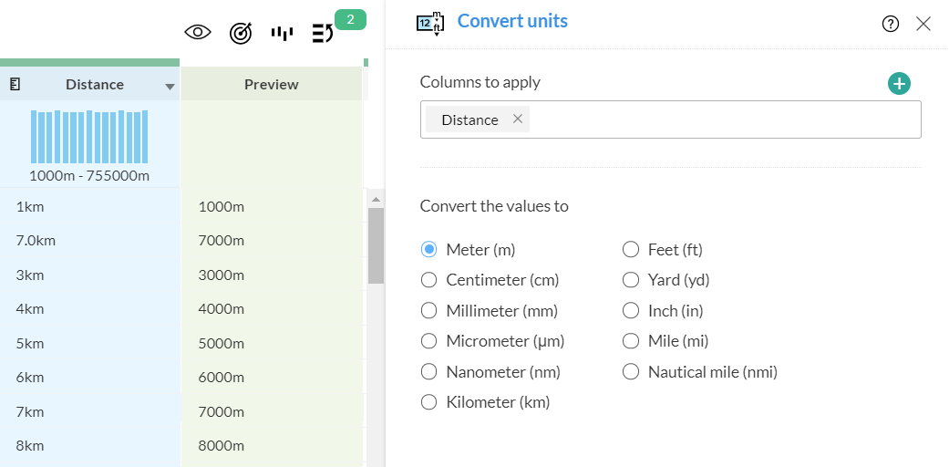 DataPrepでは、データ変換時の特別な要件に対応するための専用操作が用意されています。例えば、異なる測定基準を使用する複数の地域とデータセットを共有する必要がある場合、 受注データを[パッケージ]データに変換するだけで、単位 専用の変換機能を利用できます。