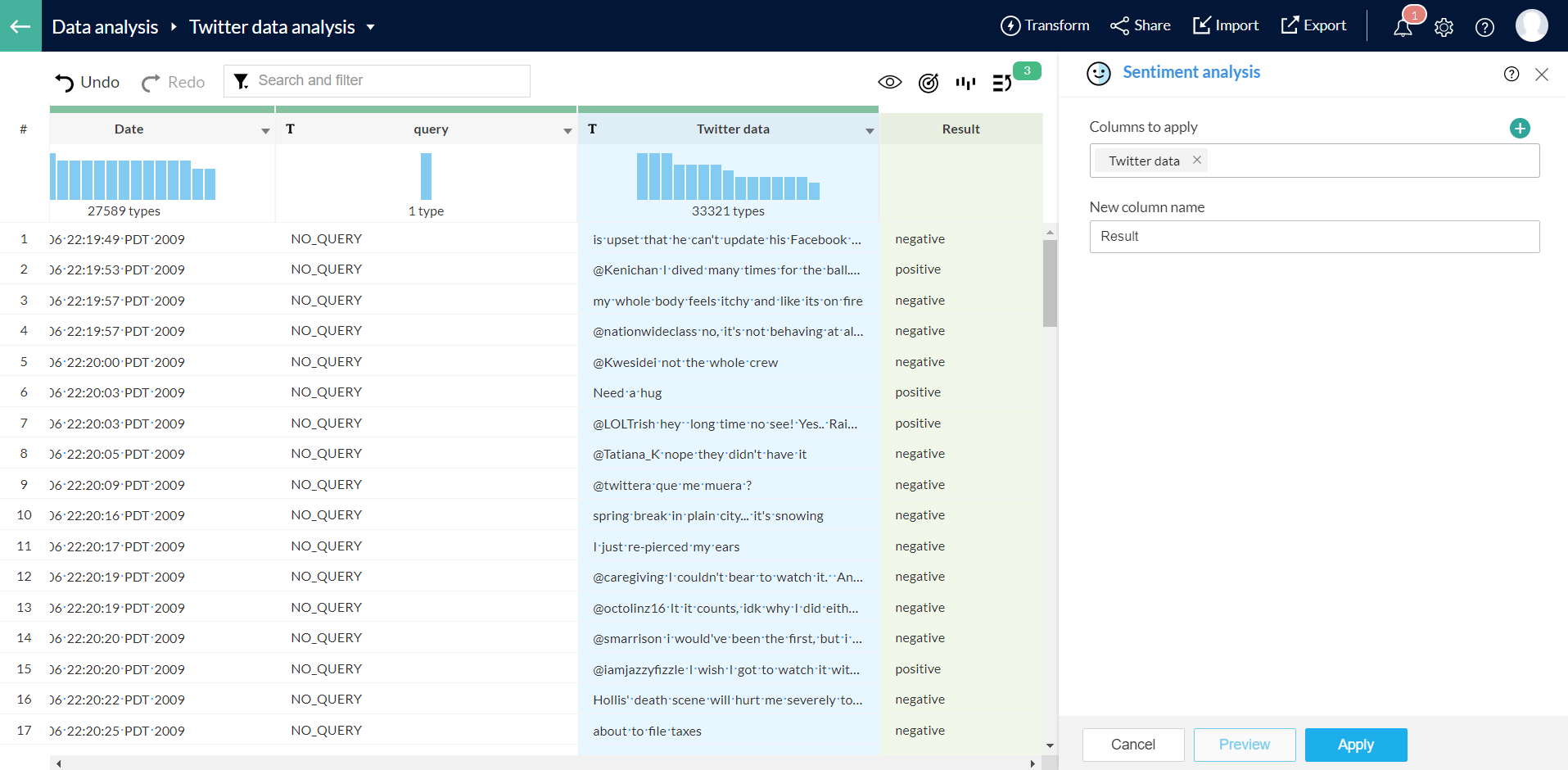 1. 列を右クリックし、コンテキストメニューからSentiment analysisを選択します。