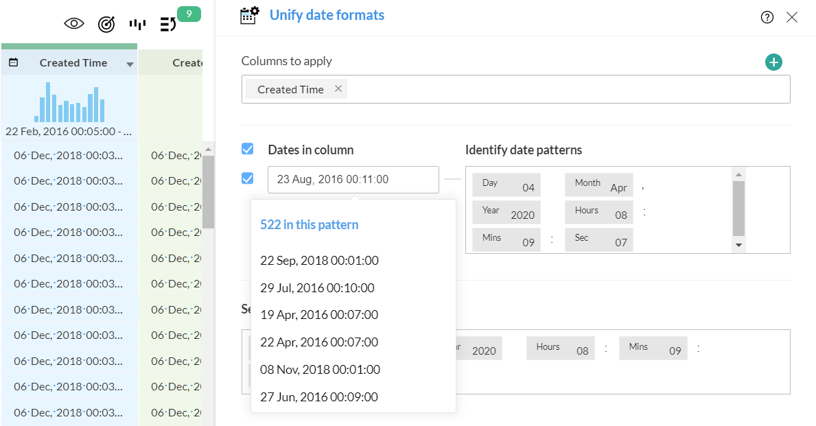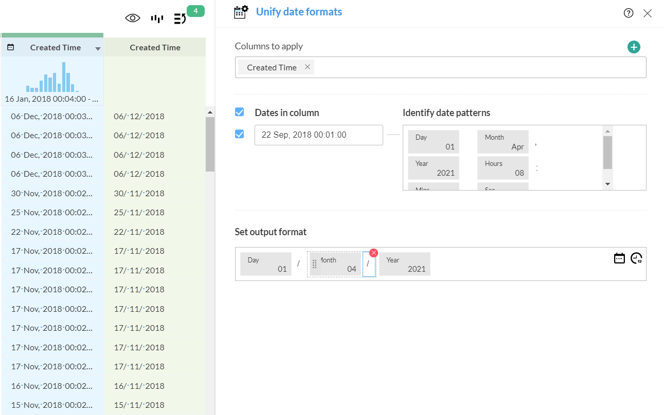 DataPrep では、unify 日付の形式 変換を使用して、列内の日付値の形式を統一することができます。