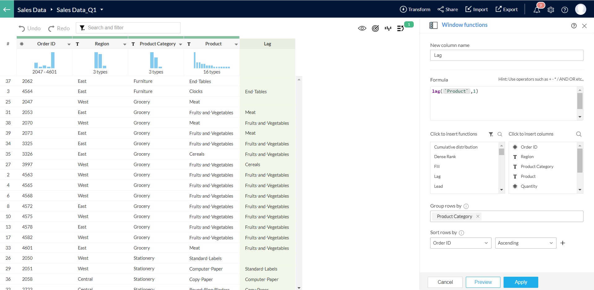 9. DataPrepはウィンドウ関数で作成された新しい列に移動します。