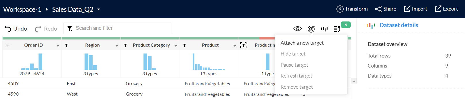 5. target を表示 - このオプションを使うと、非表示になっている target データセットを表示できます。